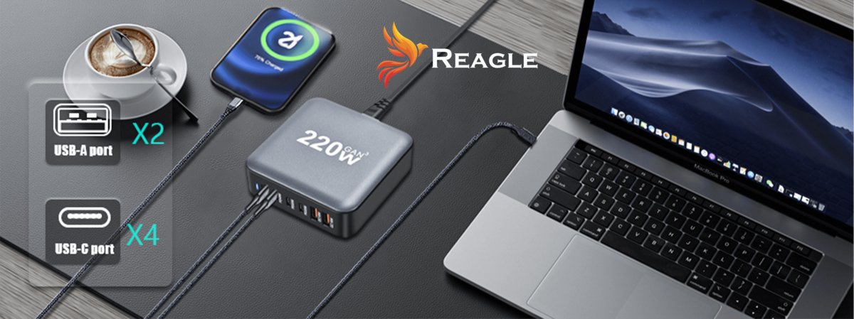 Reagle RCHAR92 to ładowarka sieciowa GaN o łącznej mocy 220W z czterema portami USB-C i dwoma USB-A w zestawie z podstawką i zasilaczem 2.5A.