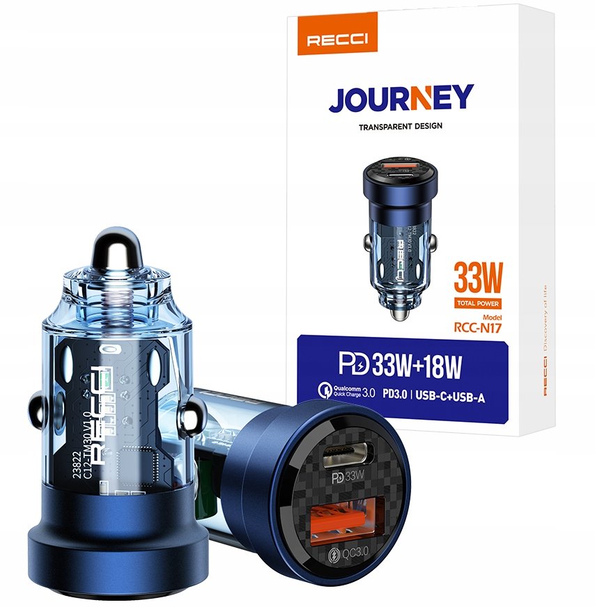 SZYBKA ŁADOWARKA SAMOCHODOWA USB-C TYP C i USB QC PD 3A 33W RECCI