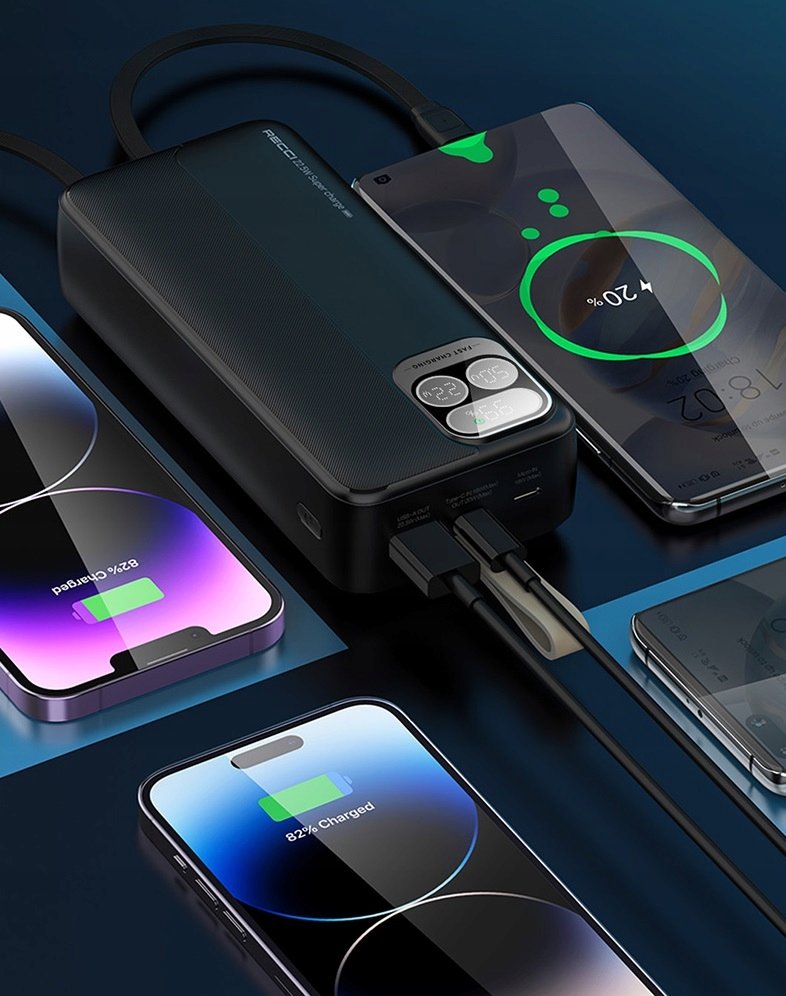 Powerbank RECCI został wyposażony w szybkie złącza dzięki czemu używanie Powerbanka stało się jeszcze bardziej wygodne. Dzięki wbudowanym kablom zapomnij o ich pilnowaniu w czasie podróży.