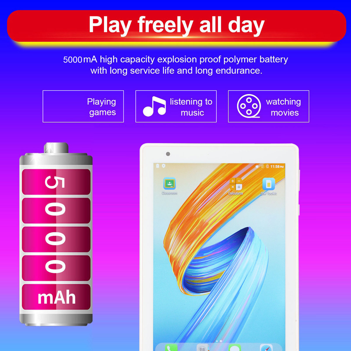 5. Akumulator 5000mAh: Komputer tabletowy ma wysokopoziomowy akumulator 5000mAh i port ładowania Typ C dla codziennej rozrywki i podróży.