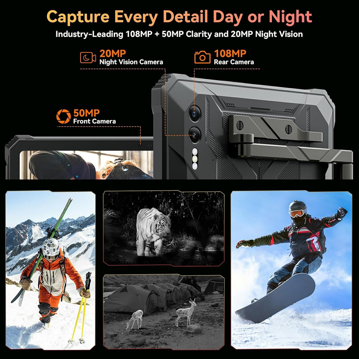 【Kamera AI 108 MP + 50 MP + 20 MP】Przemysłowa kamera AI 108 MP + kamera noktowizyjna 20 MP. Uchwyć świat w oszałamiającej ostrości dzięki kamerze AI 108 MP i 50 MP. Kamera noktowizyjna 20 MP z podczerwienią pozwala odkryć tajemnice ciemności, co jest idealne do zastosowań w ochronie, eksploracji na świeżym powietrzu i monitoringu dzikiej przyrody. Nagrywaj zachwycające filmy w rozdzielczości 2K i ulepszaj zdjęcia za pomocą narzędzi AI, takich jak Magic Eraser, AI Sky Replacement i Portrait Blur.