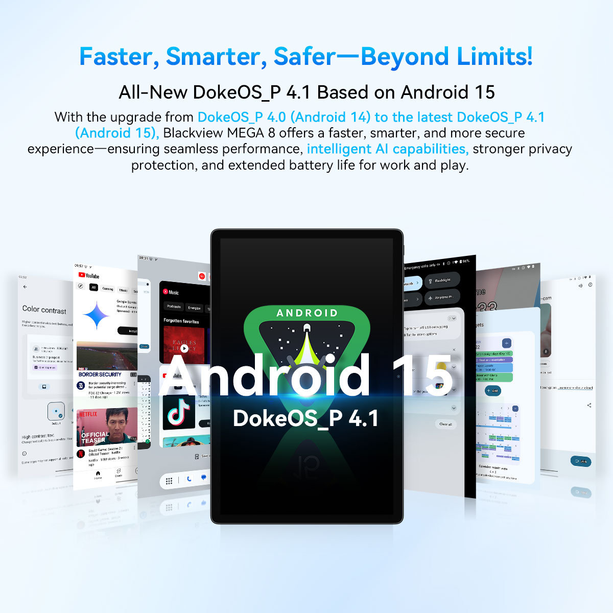 Tablet BLACKVIEW Mega 8 o przekątnej 13 cali z rozdzielczością 1920 x 1200 px, wyposażony w procesor Unisoc UMS9230S (T620). Pamięć RAM o wielkości 12 GB, pamięć masowa 256 GB. Zainstalowany system operacyjny Android 15. Tablet posiada modem LTE.