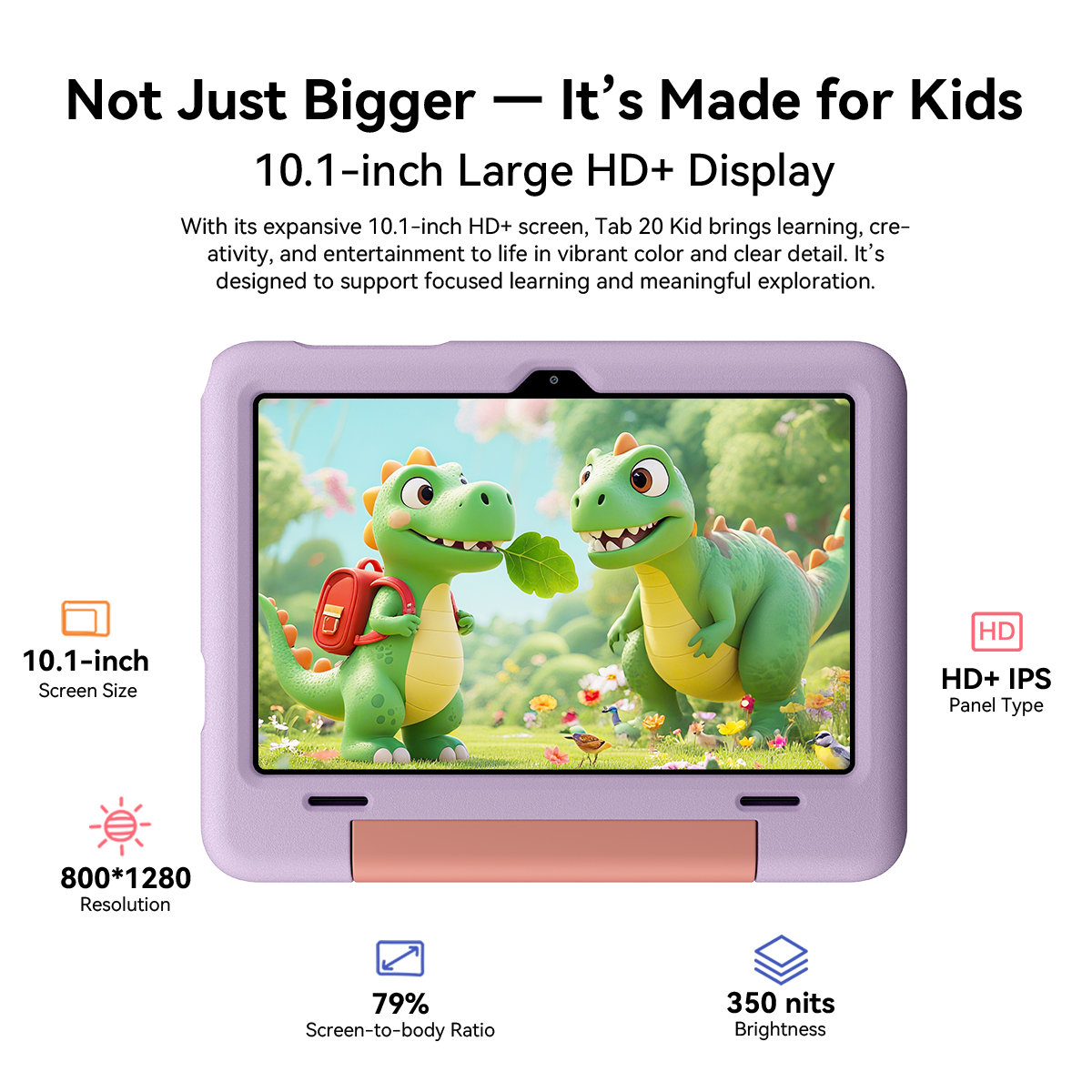 【Tablet 10,1 cala】 Dzięki dużemu ekranowi HD+ o przekątnej 10,1 cala tablet Tab 20 Kid ożywia naukę, kreatywność i rozrywkę, zapewniając żywe kolory i wyraźne szczegóły. Został zaprojektowany, aby wspierać skoncentrowaną naukę i sensowne odkrywanie świata.