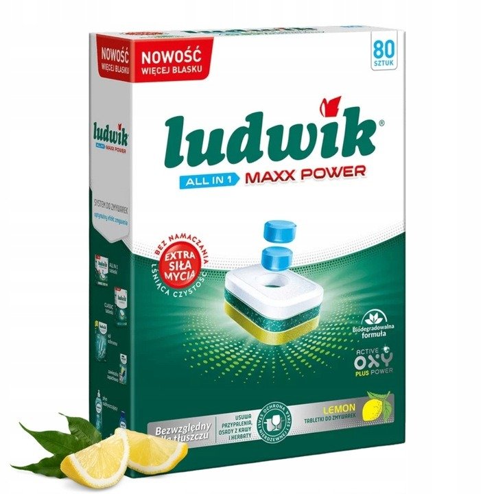Ludwik tabletki do zmywarek MAXX Power ALL IN 1 posiadają innowacyjną, biodegradowalną formułę o wzmocnionej skuteczności z systemem Active Oxy Power Plus, która dzięki kompleksowemu działaniu środków alkalicznych, enzymów i aktywnego tlenu bezwzględnie walczy z tłuszczem i przypaleniami. Efektywnie usuwa nawet najbardziej uporczywe zabrudzenia bez konieczności namaczania i zapobiega zaciekom. Zapewnia lśniącą czystość i nadaję jeszcze więcej blasku mytym naczyniom. Zawarte w formule specjalne substancje zapobiegają matowieniu oraz korozji szkła i stali nierdzewnej.