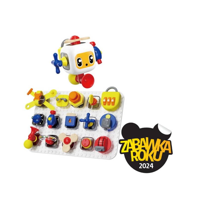 Z tablicą manipulacyjną od TOBRIGHT maluchy wyruszą w podróż edukacyjną. Zestaw składa się z kostki, tablicy z wypustkami i 15 doczepianymi elementami. Dzięki przemyślanej konstrukcji ruchome części można złączyć z kostką lub tablicą. Dziecko ma do dyspozycji przyciski, pokrętła, głośny klakson, przełącznik czy kluczyk do przekręcania. Każdy z elementów zabawki ma zastosowanie w życiu codziennym osób dorosłych.