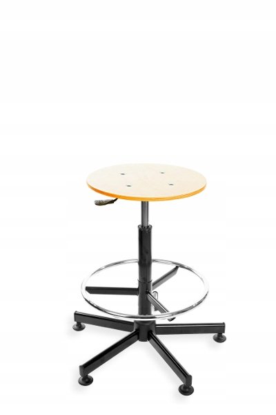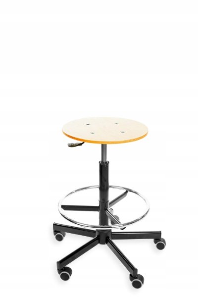 Niezniszczalny taboret pracowniczy z metalową podstawą i tapicerowanym siedziskiem oraz z regulacją wysokości poprzez amortyzator gazowy.