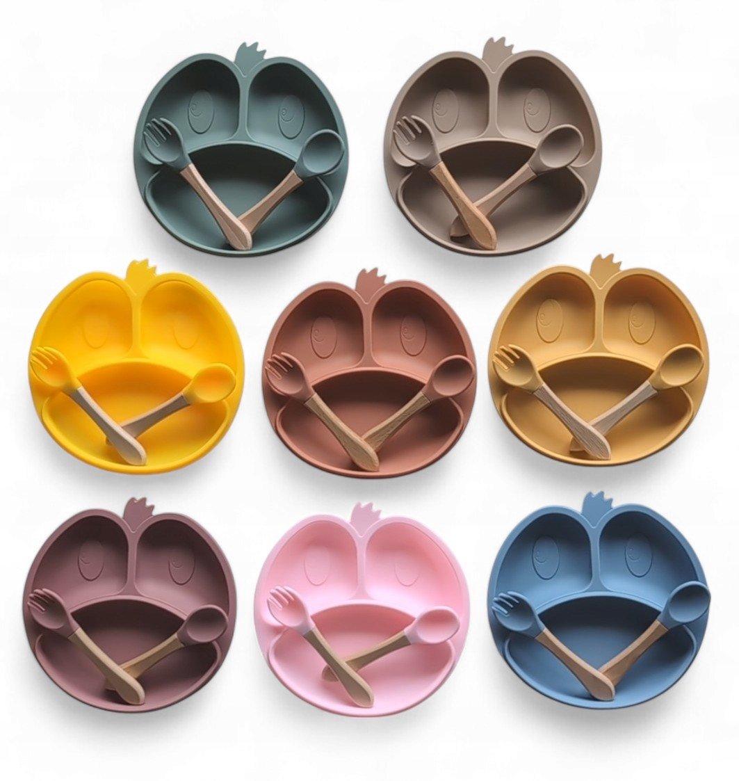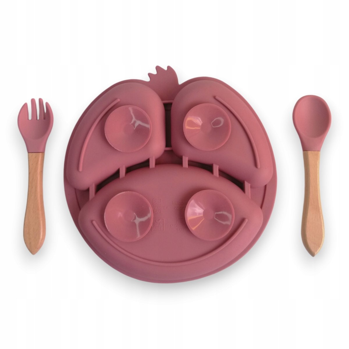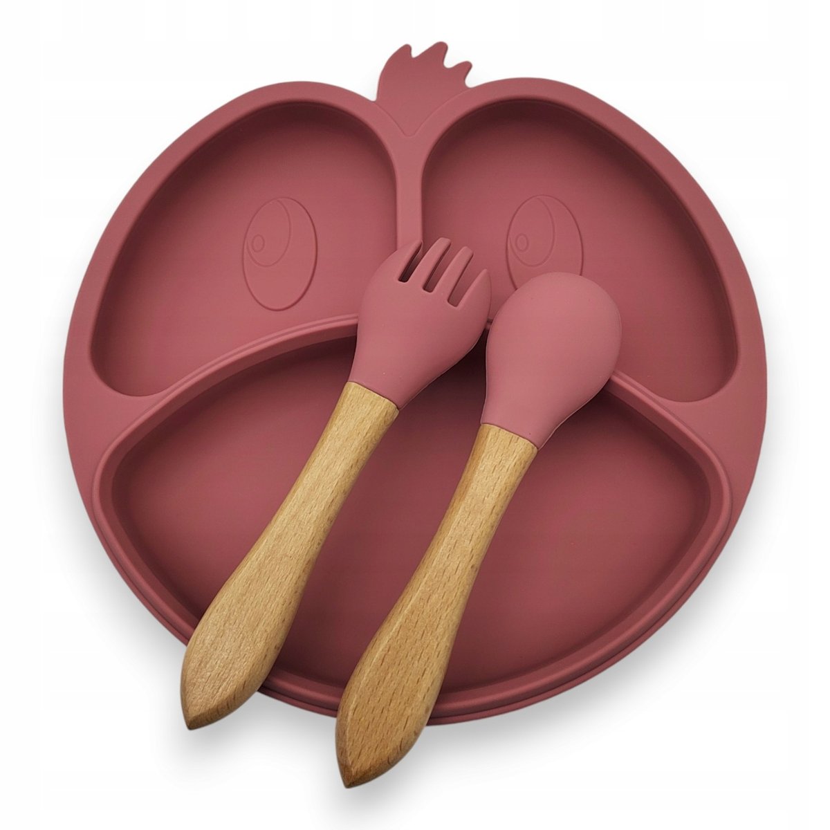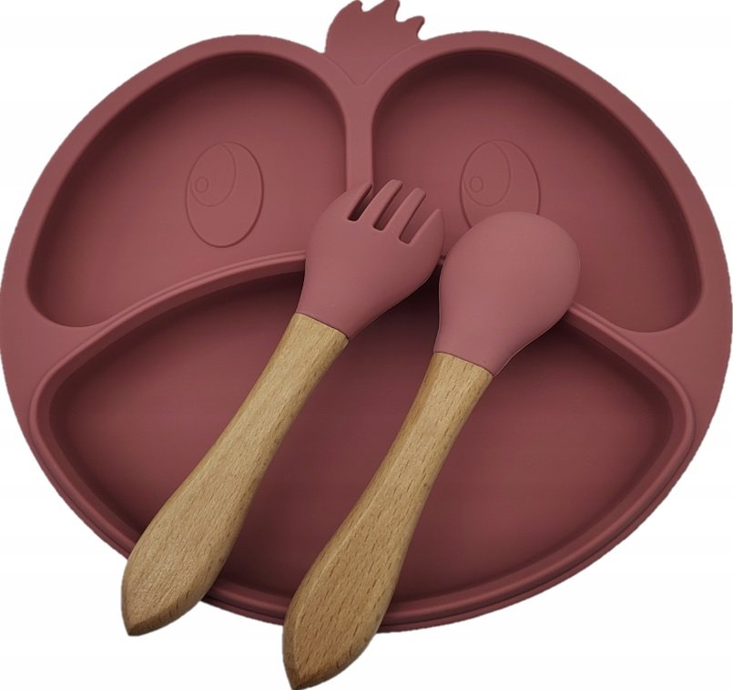 Dołączone do talerzyka drewniane sztućce z silikonową końcówką, zostały wyprofilowane z myślą o najmłodszych, posiadają miękkie i zaokrąglone końcówki które są bezpieczne dla delikatnej buzi dziecka.