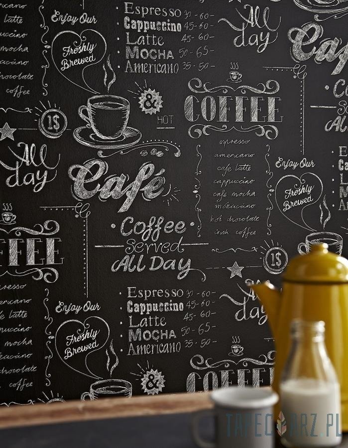 Wspaniała tapeta winylowa stworzona z myślą o miłośnikach kawy. Jej białe wzory stanowią piękną imitację kredowych rysunków wykonanych na czarnej, lekko połyskującej tablicy. W skład wklęsłych elementów kawiarnianego motywu wchodzą m.in. filiżanki z gorącym napojem, dymki, monety, gwiazdki, ornamenty oraz liczne napisy (głównie z nazwami różnych kaw). Modna dekoracja kuchni lub jadalni. Można połączyć ją z każdym kolorem mebli i dodatków. Wyprodukowana na podkładzie flizelinowym. Odporna na zmywanie.
