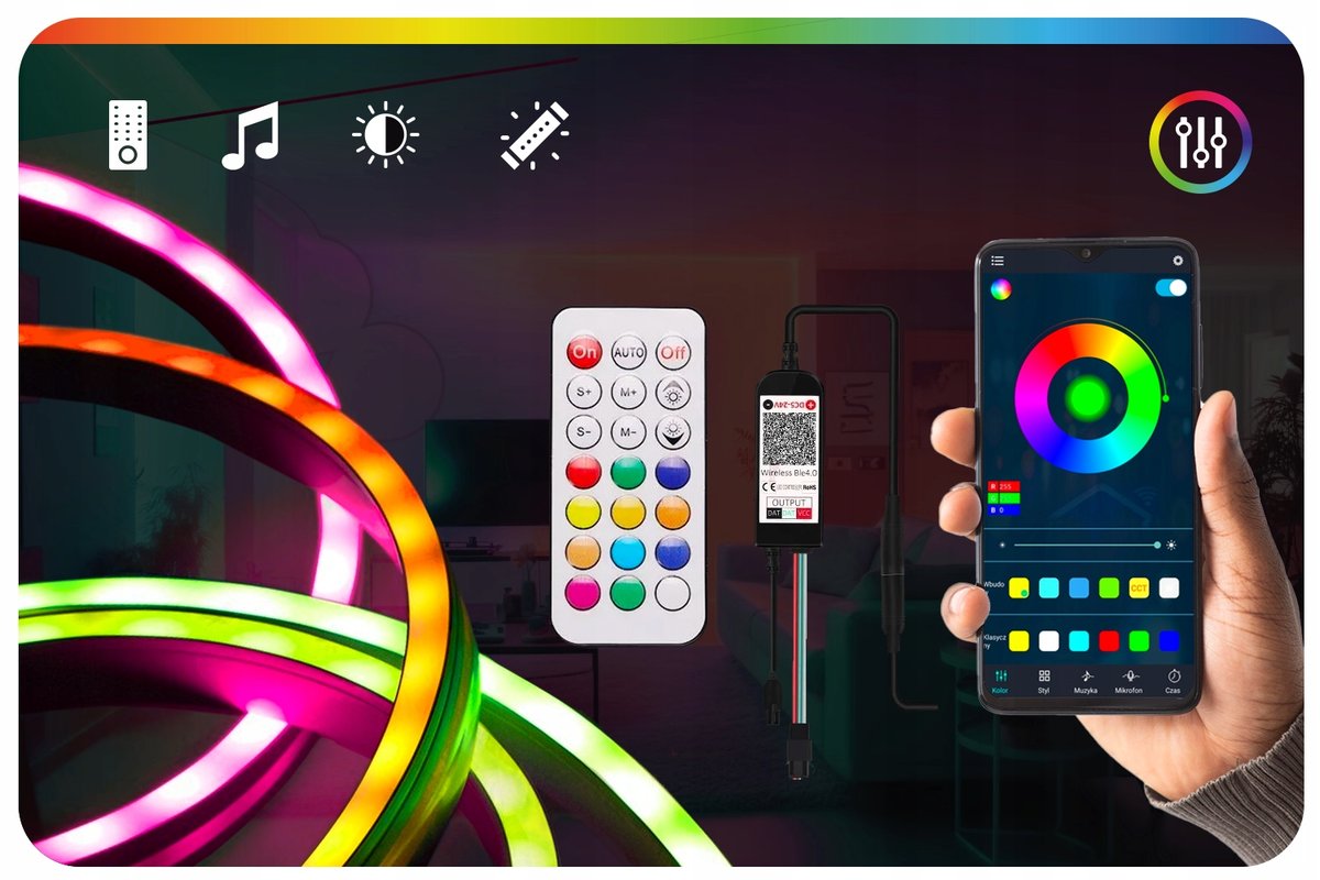 Taśmą NEON można sterować za pomocą telefonu dzięki Aplikacji.