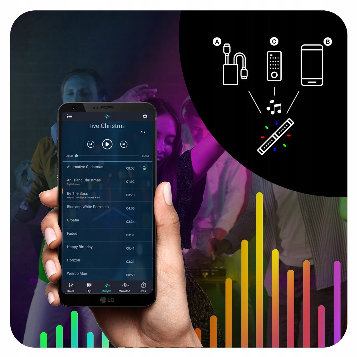 Umożliwia zmianę światła LED wraz z rytmami muzyki, dzięki czemu impreza staje się lepsza