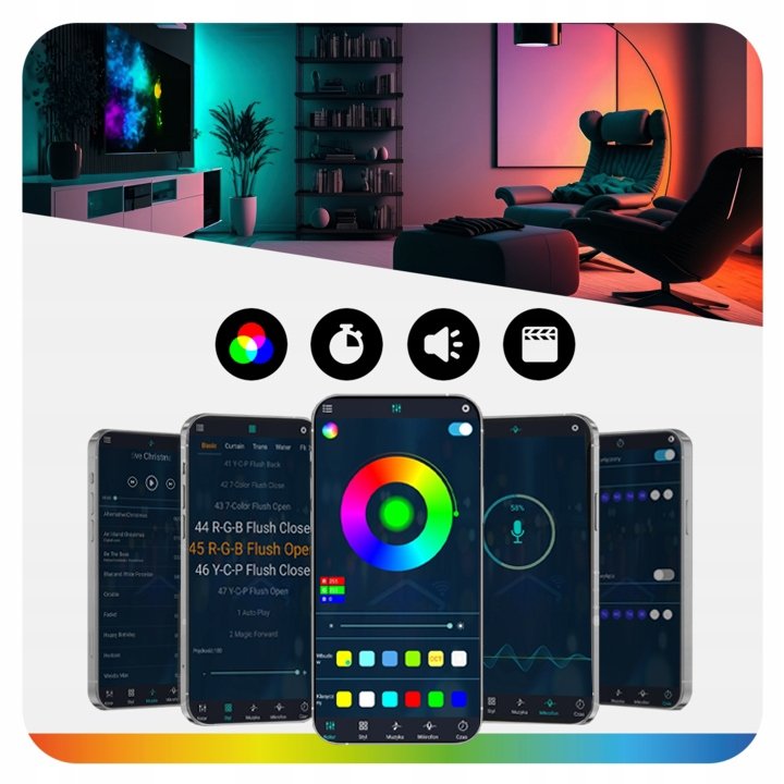 4️⃣Tryb muzyczny, dzięki któremu mając swoją ulubioną muzykę na telefonie taśma LED będzie zmieniać kolory w rytm muzyki.