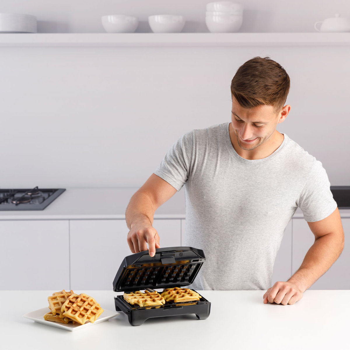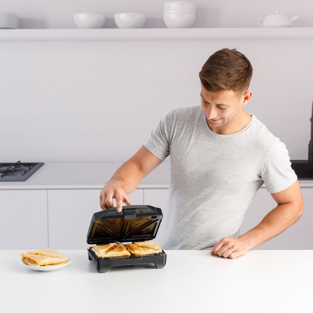 Moc: 900 WDiody LED: Operacje, TemperaturaRobienie gofrów: TakPowłoka nieprzywierająca: TakNienagrzewający się uchwyt: TakKolor produktu: Czarny, Stal nierdzewnaGrillowanie: TakIlość kanapek: ...