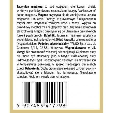 Składniki: Taurynian magnezu, substancja wypełniająca: inulina (prebiotyk) Skład kapsułki: celuloza roślinna (wegetariańskie)