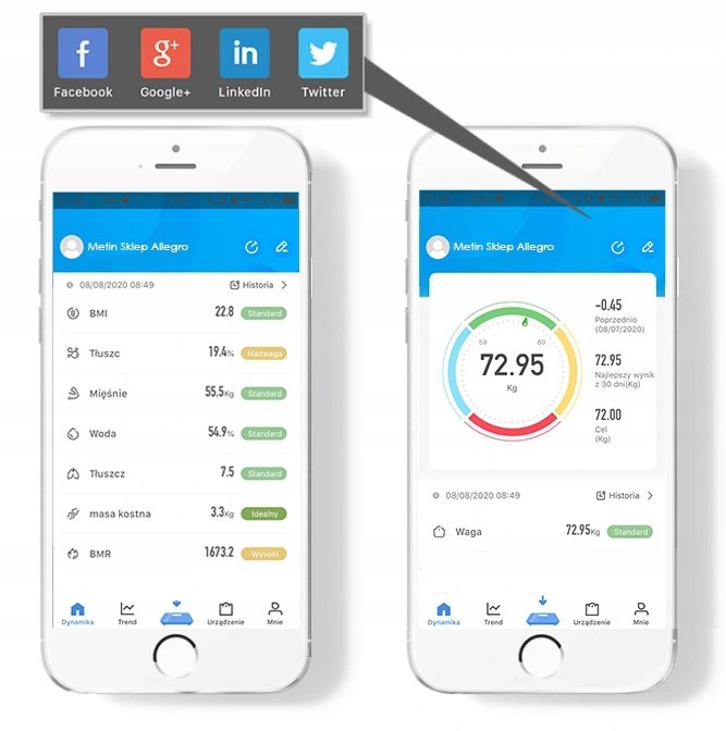 Wyniki swojego ważenia oraz innych pomiarów możesz wyświetlać i zapisywać na smartfonie. To praktyczny sposób, dzięki któremu informacje o formie fizycznej będą łatwo dostępne oraz uporządkowane. Aby aktywować tę funkcję wystarczy połączyć się z Wi-Fi lub Bluetooth, a następnie pobrać dedykowaną aplikację i sparować urządzenia.