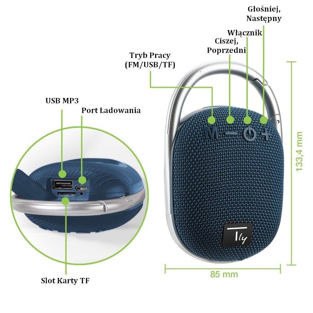 Głośnik BT 5.3 Techly ICASBL321BL, P/N: 365719 – Przenośny Głośnik Bluetooth TWS z Kolorowym Podświetlaniem LED, MP3 USB/TF, Radio FM, 5W, Karabińczyk