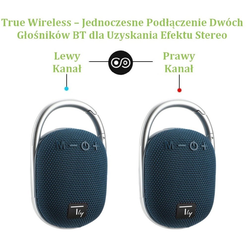 Obsługuje technologię TWS - True Wireless, która umożliwia sparowanie dwóch głośników BT i uzyskanie efektu dźwięku stereo