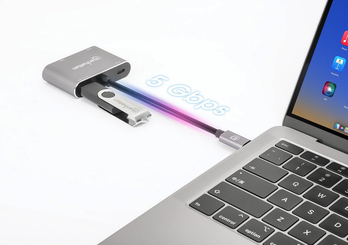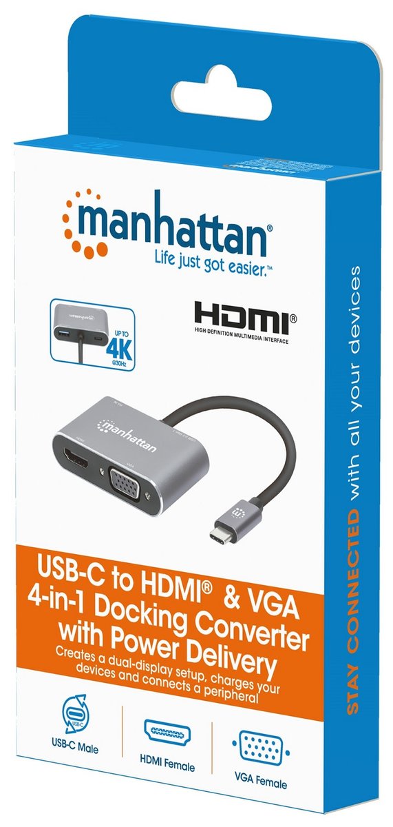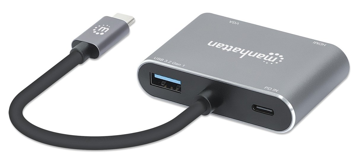 Przejściówka USB-C Manhattan 130691 – Hub Adapter USB-C 3.2 Gen1 na HDMI 4K*30Hz, VGA 1080p, USB-A 5Gbps, z Funkcją Zasilania USB-C Power Delivery 87W Cechy produktu: Umożliwia podłączenie do ...