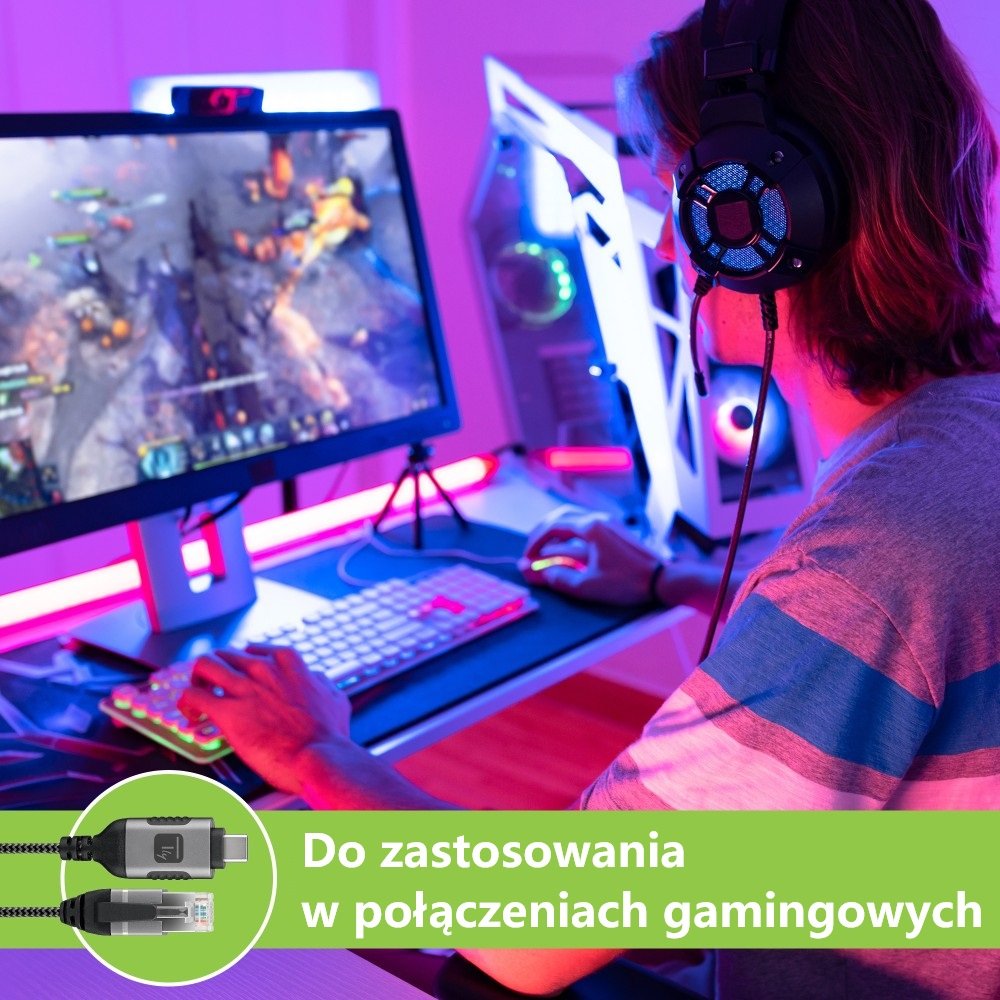 - Zakończony męskim wtykiem USB-C oraz męskim wtykiem RJ45