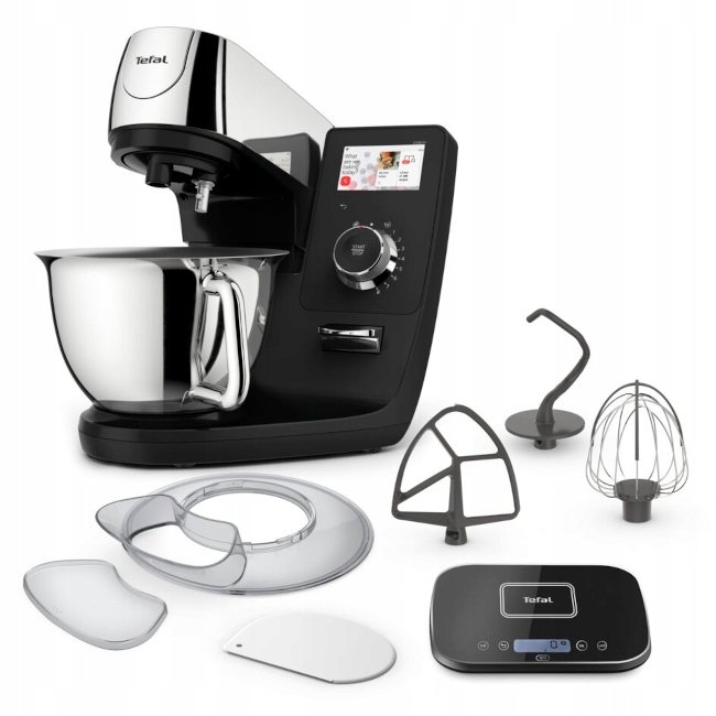 Zakres dostawy: robot kuchenny Tefal I-Coach Touch, trzepaczka, trzepaczka, hak do zagniatania, pokrywka miski, narzędzie do mieszania, dostępna aplikacja dla systemu Android lub iOS