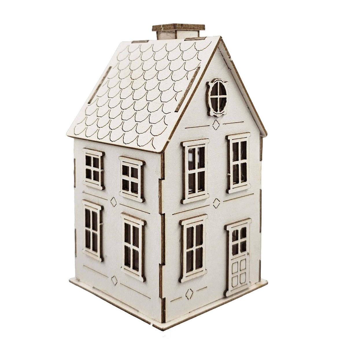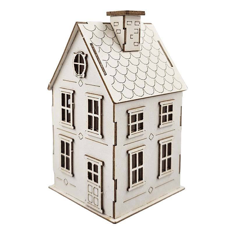 Przestrzenny model - domek - do samodzielnego montażu. Wysokość ok. 9,3 cm Wymiary podstawy 5,7 x 5,7 cm Idealnie pasuje do exploding boxa 10x10x10. Wykonany z białej tekturki 1,2 mm