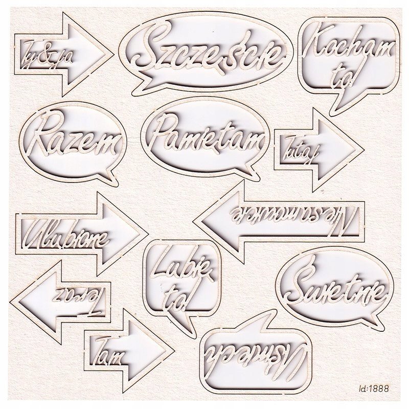 Zestaw 13 strzałek ze słówkami w arkuszu 14x14 cm.