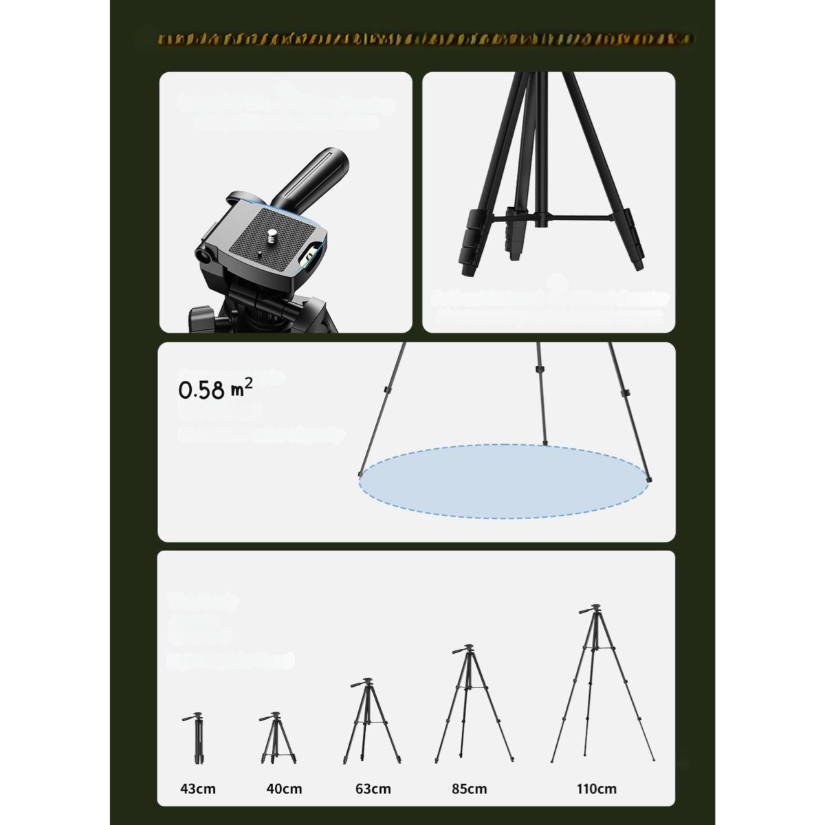 - Lekki statyw z regulacją teleskopową: statyw posiada konstrukcję z przyciskiem pociągania, trzy sekcje teleskopowe oraz regulowaną oś środkową, umożliwiającą ustawienie wysokości od 40 do 110 cm. Waży jedynie 600 g, co czyni go wygodnym w podróży, a innowacyjny drążek napinający zwiększa stabilność zacisku. Dodatkowo wyposażony jest w 17 otworów gwintowanych, zimną stopkę i uniwersalną śrubę 1/4, co pozwala na szeroką współpracę z różnymi akcesoriami fotograficznymi.