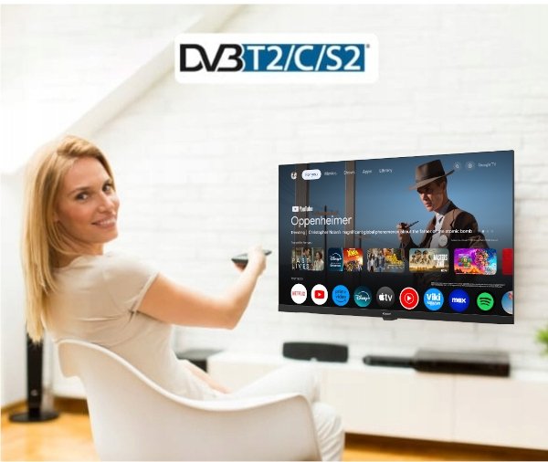 Telewizor ma wbudowany potrójny tuner DVB‑T2/C/S2 zgodny z kodekiem HEVC H.265. Wystarczy więc, że podłączysz antenę zewnętrzną, aby móc odbierać naziemny sygnał cyfrowy, ciesząc się darmową ofertą kilkudziesięciu kanałów.