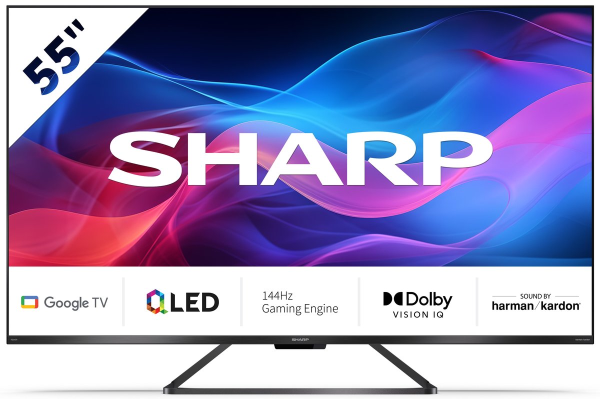 55GR8465E to bezramkowy telewizor QLED Sharp Google TV o rozdzielczości 4K Ultra High Definition i częstotliwości odświeżania 144 Hz.