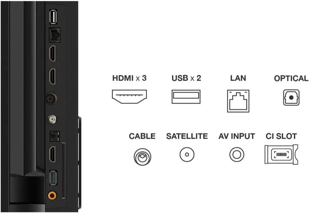 Telewizor oferuje szereg portów i złącz, które umożliwiają podłączenie różnych urządzeń. Posiada 3 złącza HDMI, 1 złącze USB oraz Ethernet (LAN), Bluetooth i CI+. Taki zestaw złączy pozwala na łatwe podłączenie dekoderów, konsol do gier oraz systemów audio, co czyni to urządzenie jeszcze bardziej funkcjonalnym.Dodatkowe funkcje
