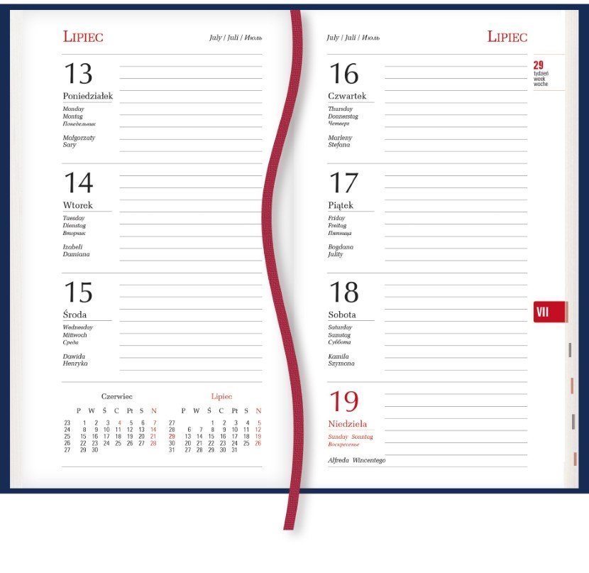 - format: 90 x 165 mm - układ kalendarium: 1 tydzień - 2 strony - ilość stron: 144 - druk: 2 kolory - rodzaj papieru: offset 70 g/m2 biały - oprawa - okładka barwna foliowana - jedna tasiemka ...