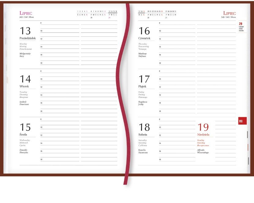 - format: A5 (145 x 205 mm) - układ kalendarium: 1 tydzień - 2 strony - ilość stron: 144 - druk: 2 kolory - rodzaj papieru: offset 70 g/m2 biały - oprawa - okładka skóropodobna Vivella, jedna ...