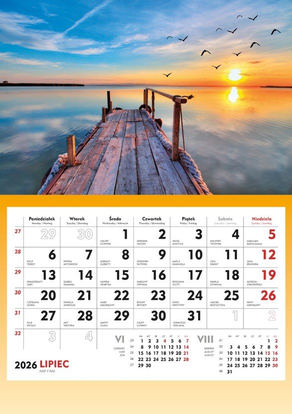 - format: 310 x 482 mm - układ kalendarium: 1 miesiąc – 1 kartka - ilość stron: 12 - druk: pełnokolorowy - rodzaj papieru: offset 80g/m2, biały - główka pełnokolorowa, okienko przesuwne, nazwy ...