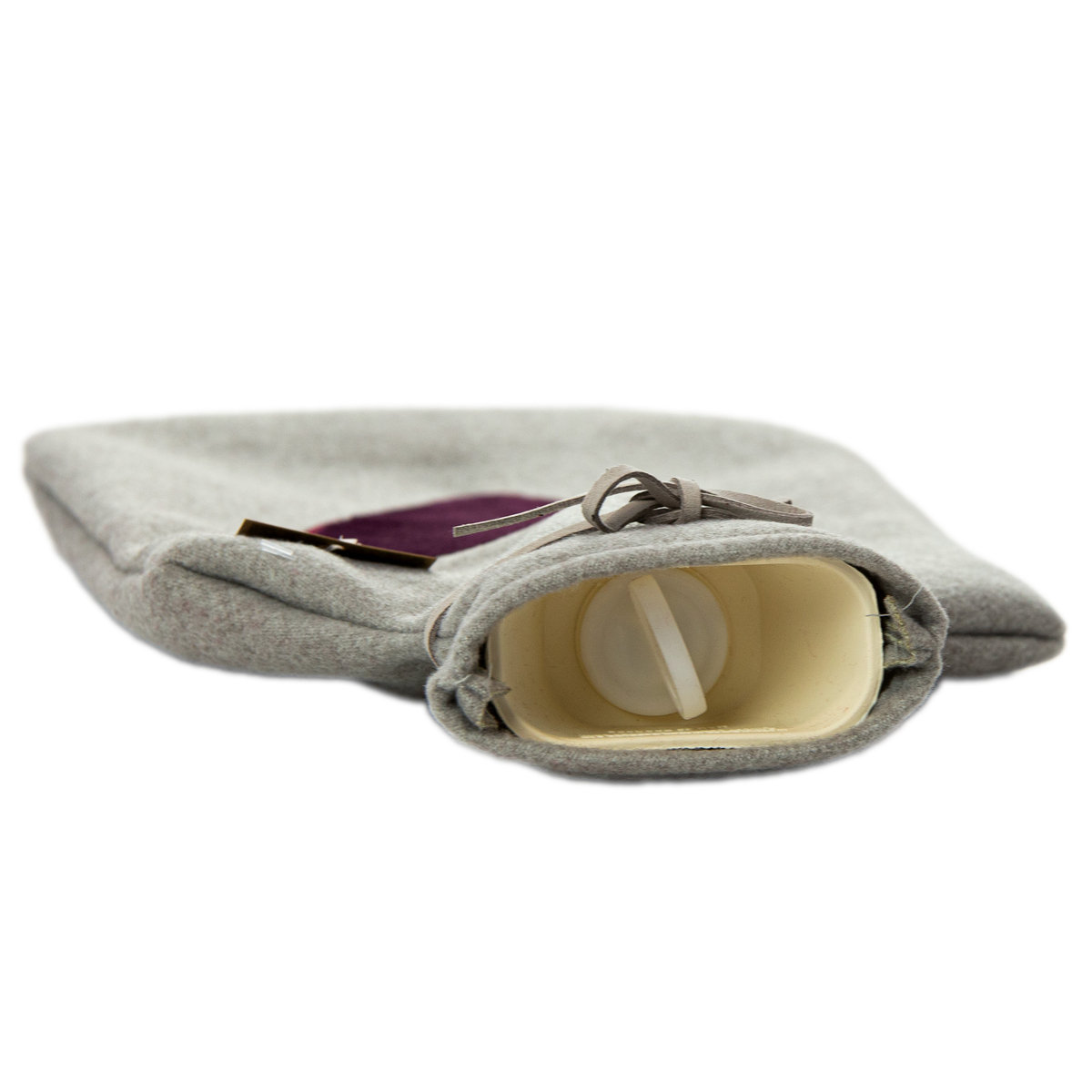 Termofor gumowy w sweterkowym pokrowcu w kolorze szarym. Ogrzeje zimne łóżko lub wybrane części ciała. Ma pojemność 1,75 litra i wymiary 21 x 34 cm, co czyni go idealnym do domowego użytku.