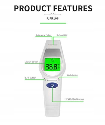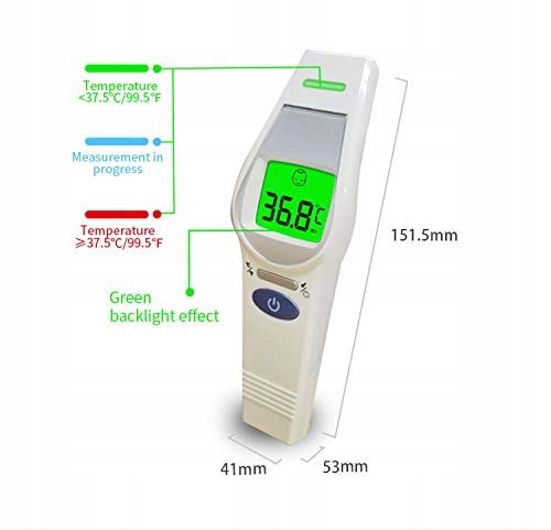 - Praktyczny termometr na podczerwień do pomiaru temperatury; natychmiastowy odczyt danych dzięki wyświetlaczowi LCD i wyświetlaczowi LED, który zmienia kolor na czerwony, gdy temperatura przekroczy 37, 5°C.