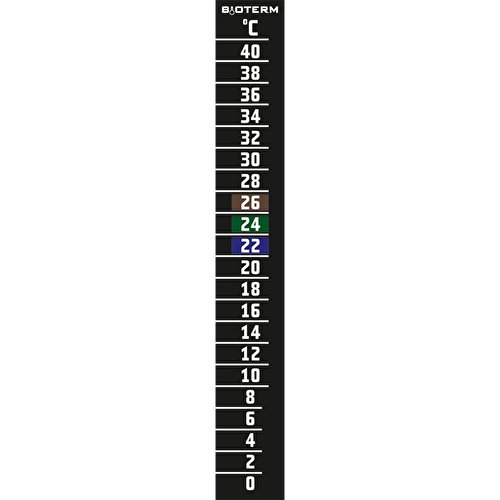 Termometr ciekłokrystaliczny, samoprzylepny. Folię zabezpieczającą termometr można zdjąć lub pozostawić. Kolor podświetlenia: niebieski – temperatura jest nieco wyższa niż wskazywana na skali; zielony – temperatura taka jak wskazywana; brązowy – temperatura nieco niższa niż wskazywana.