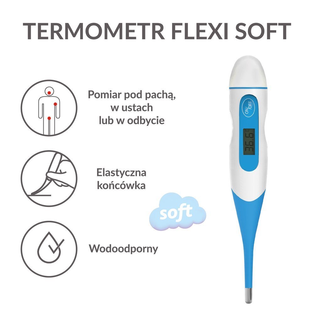 Termometr FlexiSoft KFT-03 firmy Controly jest wyrobem medycznym przeznaczonym do pomiaru temperatury ciała pod pachą, w ustach lub w odbycie. Seria Thermosoft to niezwykle przyjemne w dotyku, elastyczne końcówki o optymalnym przekroju utrzymujące stałą temperaturę - jest to szczególnie ważne w przypadku pomiaru temperatury w odbycie, ale także w ustach i pod pachą.