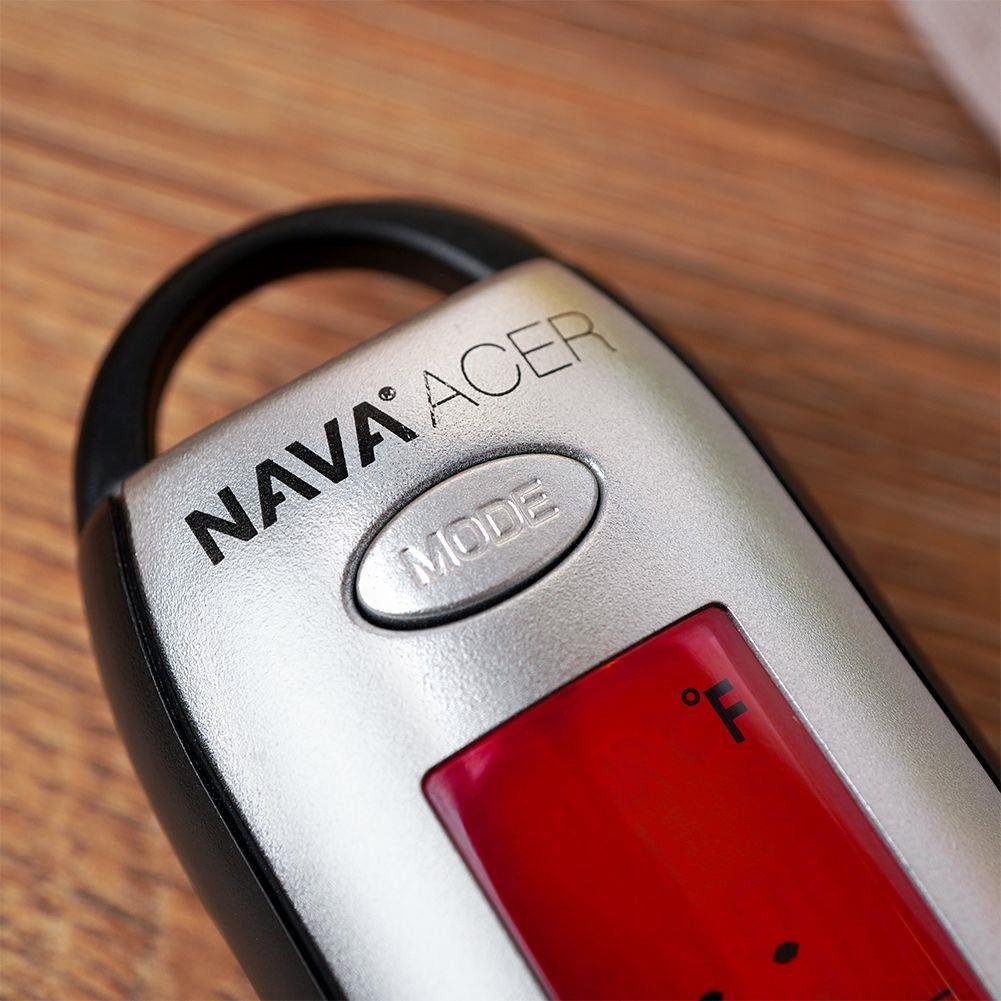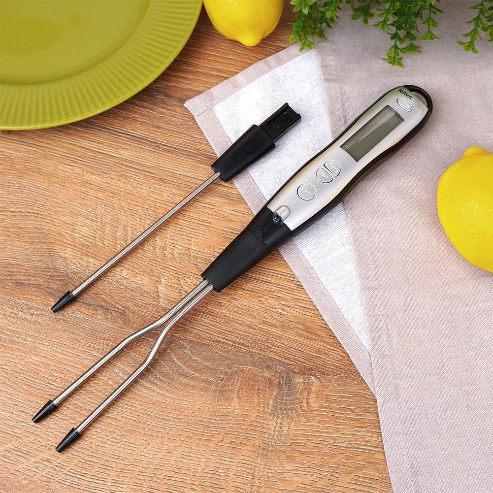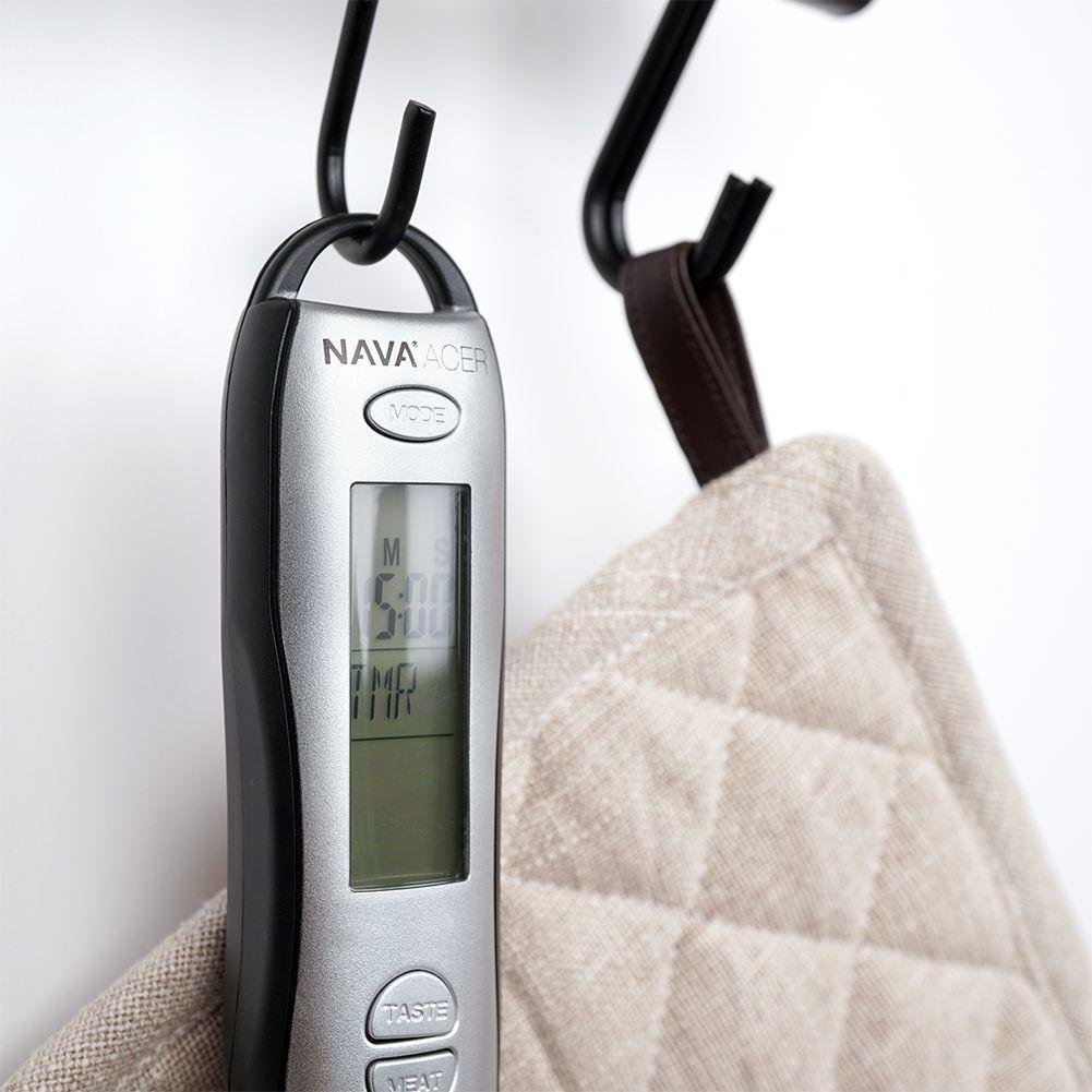 Termometr kuchenny z cyfrowym wyświetlaczem. Posiada dwie końcówki, które będziemy mogli odpowiednio dopasować do potrawy. Termometr jest poręczny i dzięki bezprzewodowej formie można zabrać go ze sobą w dowolne miejsce. Świetnie sprawdzi się podczas grillowania. Końcówka w formie widelca pomoże także w szybki sposób obrócić pieczone steki lub kiełbasę na drugą stronę. Rączka termometru jest wygodna w użytkowaniu i wygodnie leży w dłoni. Oryginalny produkt greckiej marki NAVA z linii akcesoriów kuchennych Acer. Wyprodukowano zgodnie z europejskimi standardami.