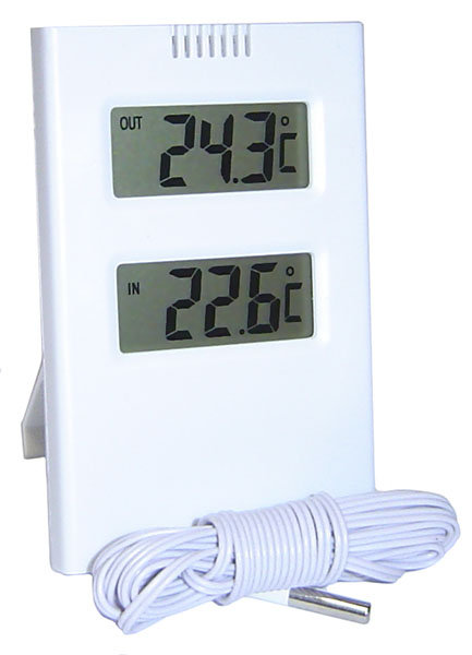 zakres temp. zew. -50°C + 60°C zakres temp. wew. -10°C + 40°C dwa wyświetlacze przewód 3m kolor biały wymiary: 65 x 100 mm zasilanie: bateria 1,5volt R6