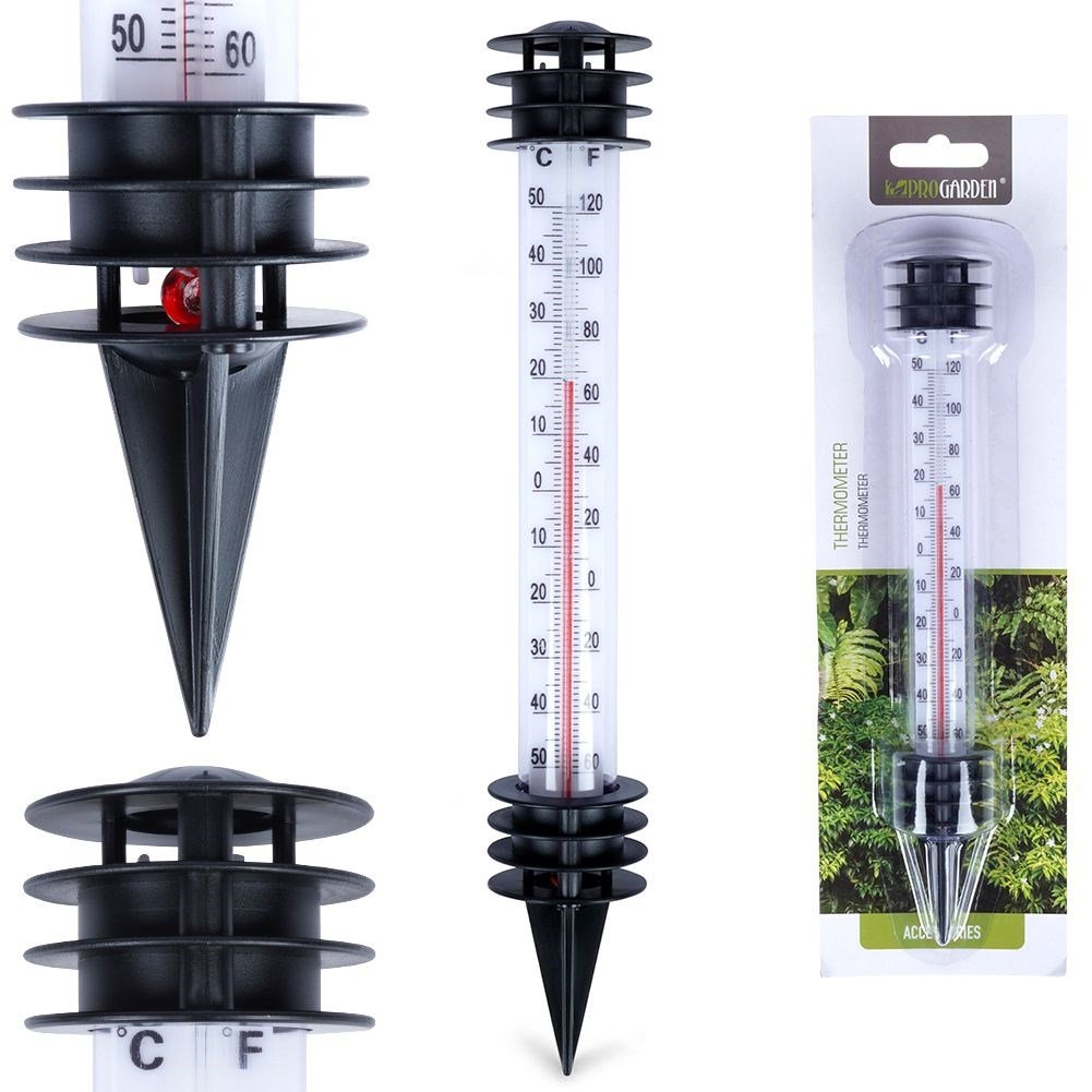 Ogrodowy termometr do pomiaru temperatury na zewnątrz. Zamocujemy go w łatwy sposób, wbijając do ziemi. Jego klasyczny wygląd sprawia, że termometr jest praktycznym dodatkiem do ogrodu czy tarasu. Oryginalny produkt holenderskiej marki ProGarden. Wyprodukowano zgodnie z europejskimi standardami.
