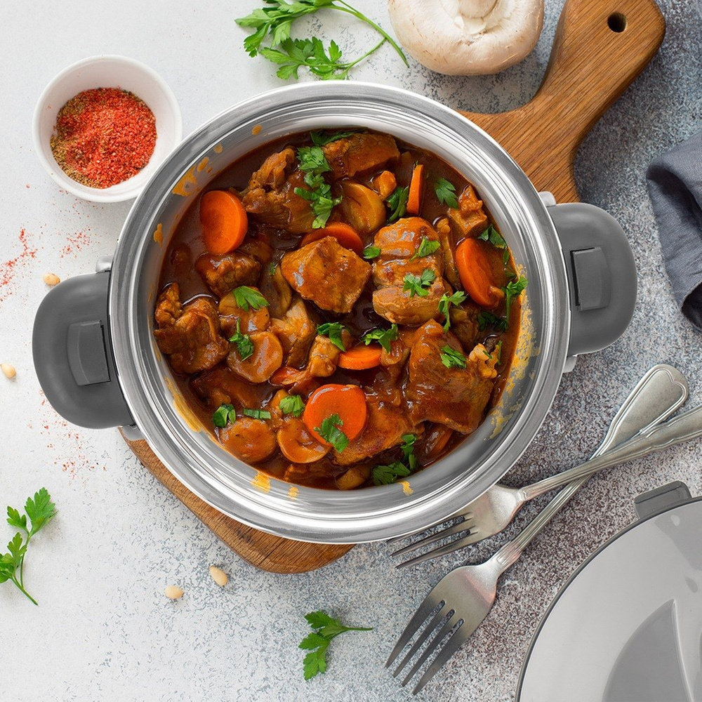 Wykonana ze stali nierdzewnej - Termomisa wewnątrz wykonana jest ze stali nierdzewnej. Zewnętrzna obudowa wykonana jest z tworzywa w szarym, perłowym kolorze. Pokrywka w kolorze szarym, a uchwyty w ciemno szarym kolorze.