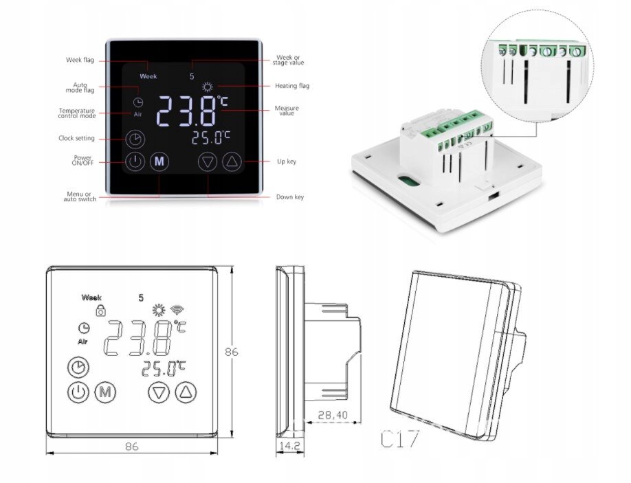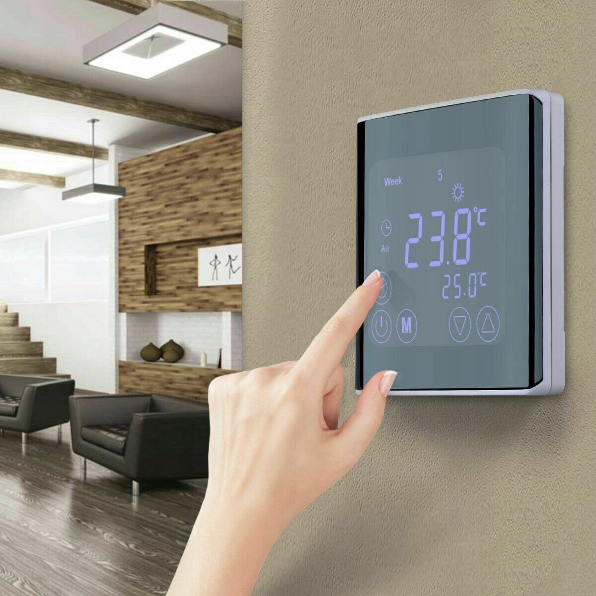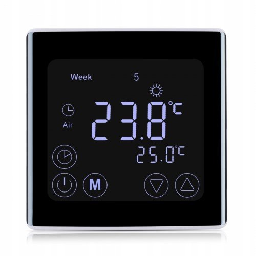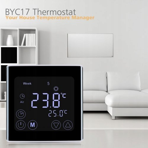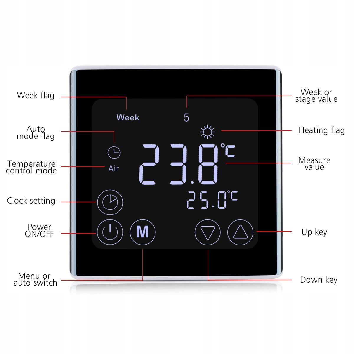 Ten termostat grzewczy z programowaniem tygodniowym przyjmuje najnowszą jednoukładową technologię sterowania komputerowego i jest przeznaczony do elektrycznego sprzętu grzewczego lub sterowania siłownikiem. W zależności od ustawionej temperatury termostat automatycznie uruchomi i zatrzyma sterowany obiekt (zawór, ogrzewanie podłogowe, ogrzewanie ścienne, grzałka elektryczna itp.). Ten termostat ma cieńszą, bardziej elegancką konstrukcję, a duży kwadratowy ekran LCD zapewnia lepsze wrażenia użytkownika w zakresie kontroli temperatury.