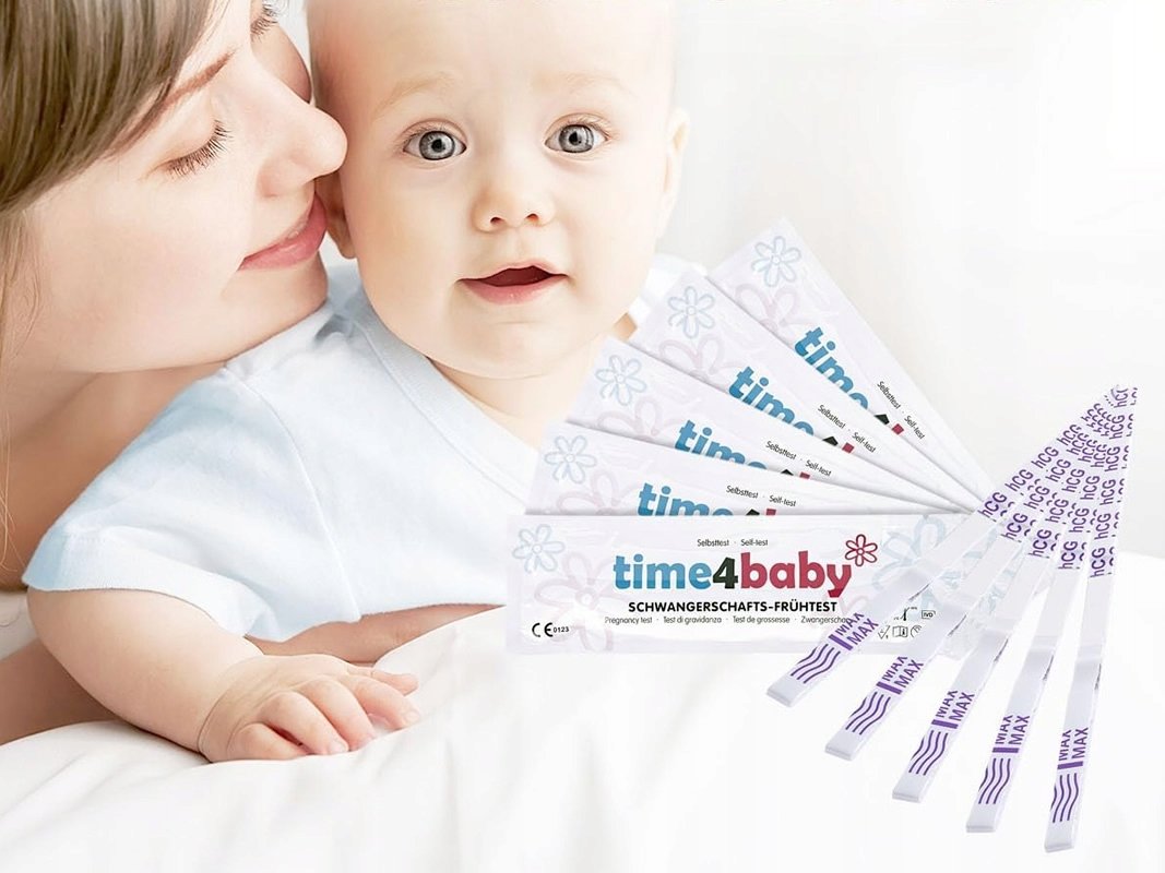 Test ciążowy paskowy time4baby służy do wczesnego zdiagnozowania ciąży - poziomu HCG w moczu.