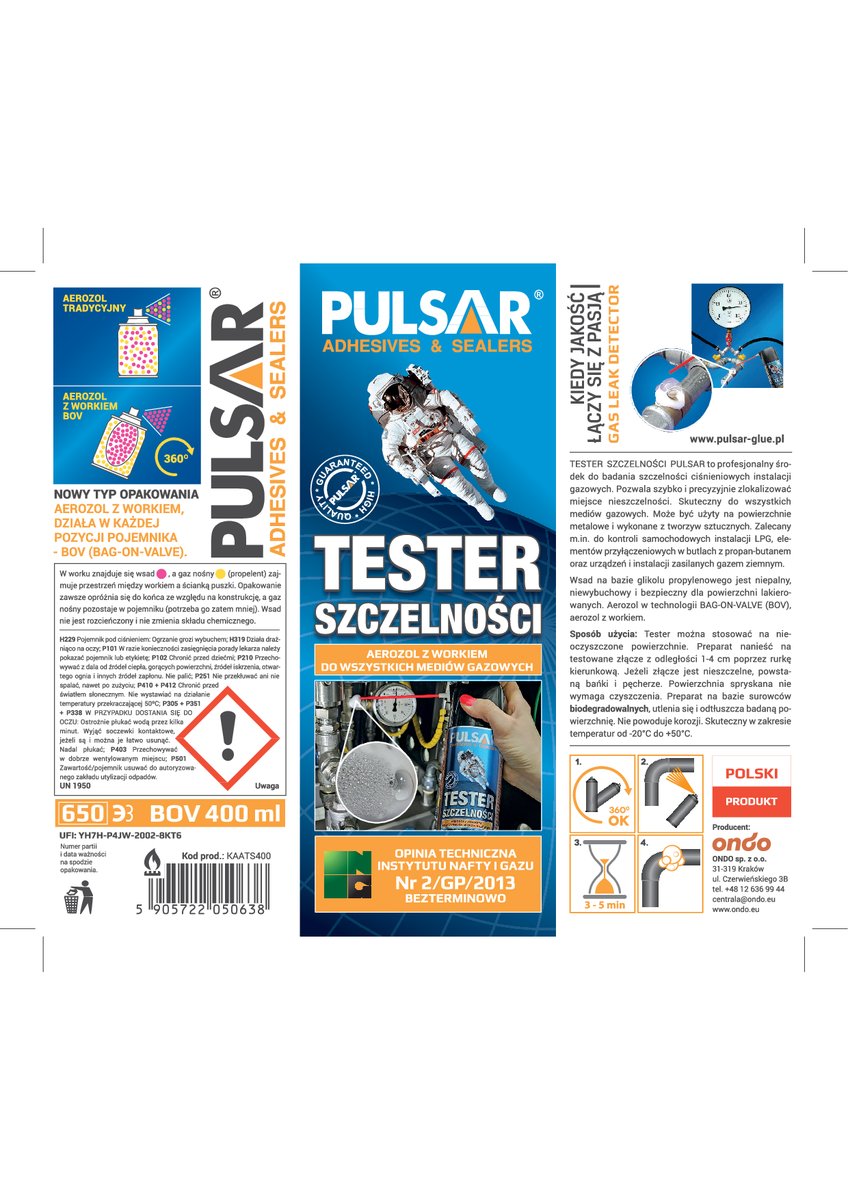 PULSAR TESTER SZCZELNOŚCI 400 ml - to profesjonalny środek do badania szczelności ciśnieniowych instalacji gazowych. Tester zawiera glikol propylenowy stanowiący jednorodną ciecz. Innowacyjność opakowania 400 ml polega na tym, że glikol znajduje się w worku umieszczonym w butli aerozolowej. Gazem pędnym jest sprężone powietrze znajdujące się między workiem a ścianką butli. Wsad preparatu jest niepalny, niewybuchowy oraz nieszkodliwy dla powierzchni lakierowanych. Zaletą testera jest jego biodegradowalność. Produkt posiada opinię techniczną Instytutu Nafty i Gazu.