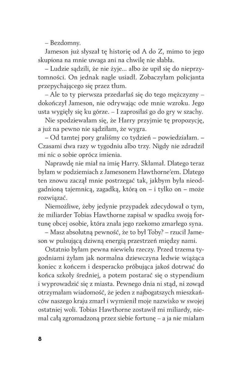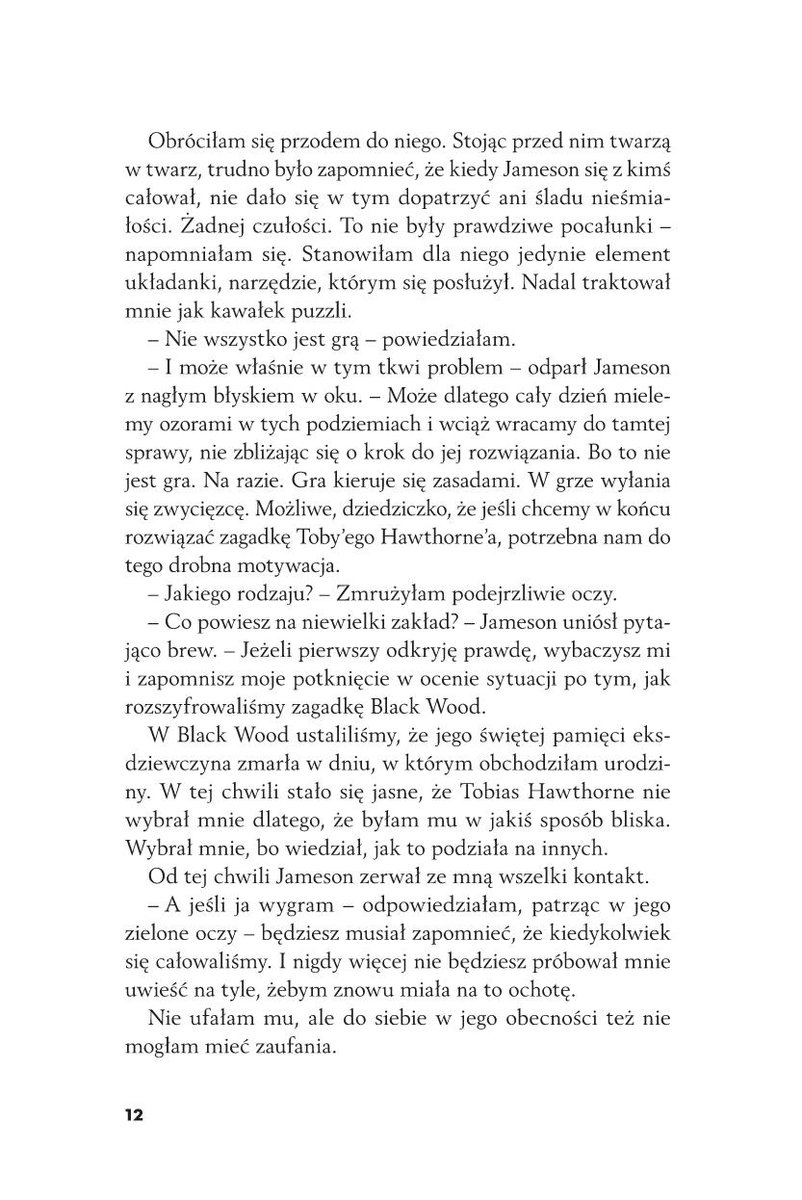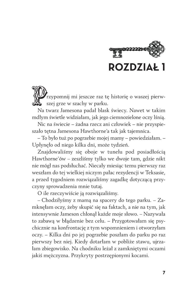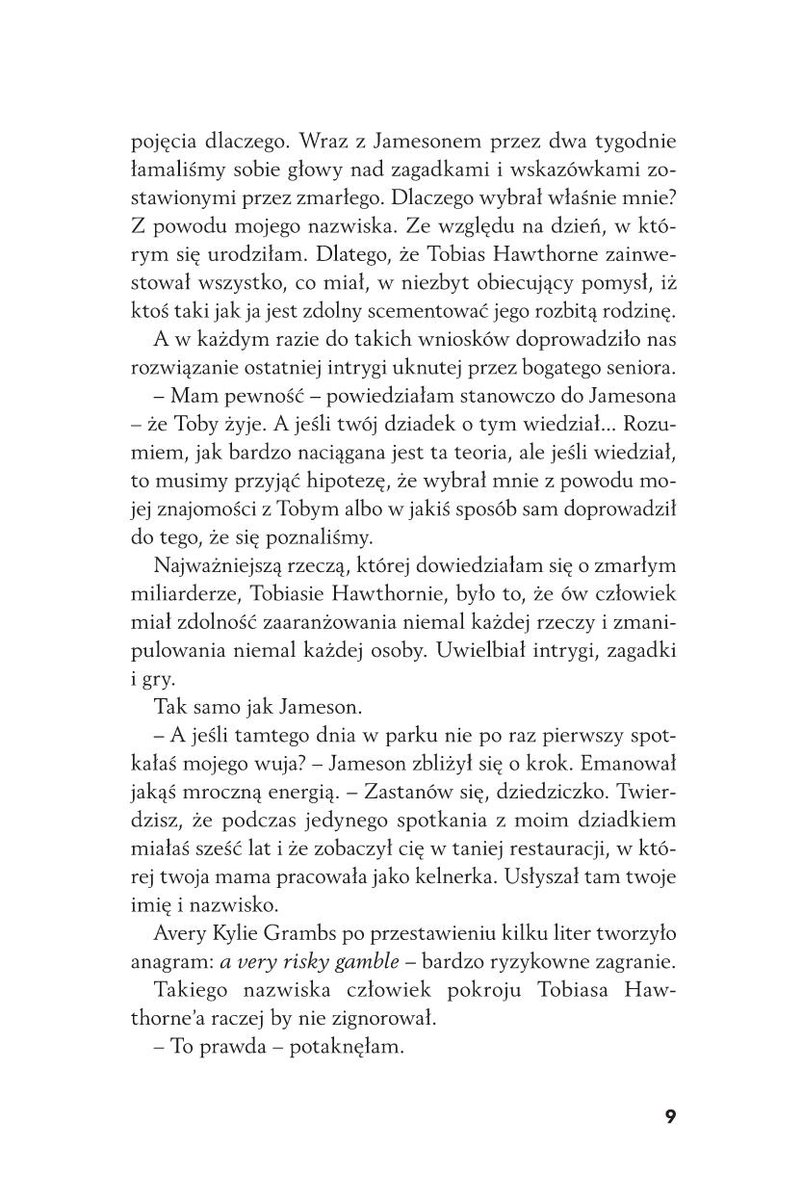 Drugi tom bestsellerowej trylogii jest równie ekscytujący jak pierwszy, tajemnica goni tajemnicę, a fabuła się zagęszcza. Na Avery Grambs na każdym kroku czyha niebezpieczeństwo, a Grayson i Jameson, magnetyczni i tajemniczy wnukowie Tobiasa Hawthorne’a, nadal towarzyszą jej na każdym kroku. Pytanie, dlaczego to ona, niespokrewniona z Hawthorne’ami dziewczyna, odziedziczyła bajeczną fortunę, ciągle nie znajduje odpowiedzi, choć pewne poszlaki wskazują, że związek Avery z rodziną jest głębszy, niż kiedykolwiek sobie wyobrażała.