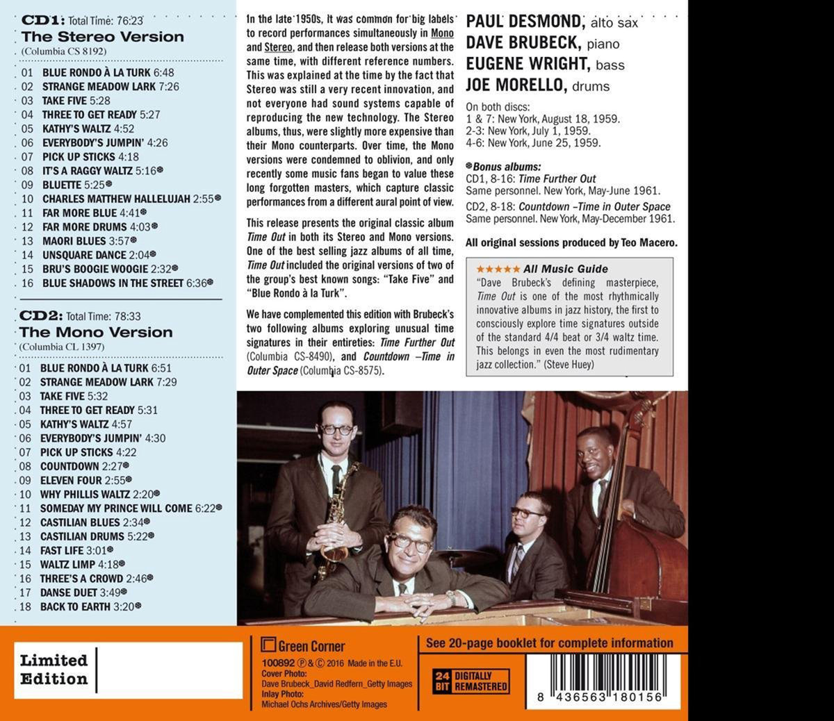 To 2-płytowe, zremasterowane (24 BIT Digitally Remastered), limitowane wydanie przedstawia oryginalny, klasyczny album Time Out w wersji Stereo i Mono. Jeden z najlepiej sprzedających się albumów jazzowych wszech czasów, „Time Out”, zawierał oryginalne wersje dwóch najbardziej znanych utworów grupy: „Take Five” i „Blue Rondo à la Turk”. Album otrzymał 5 gwiazdek* (Excelent) wg All Music Guide