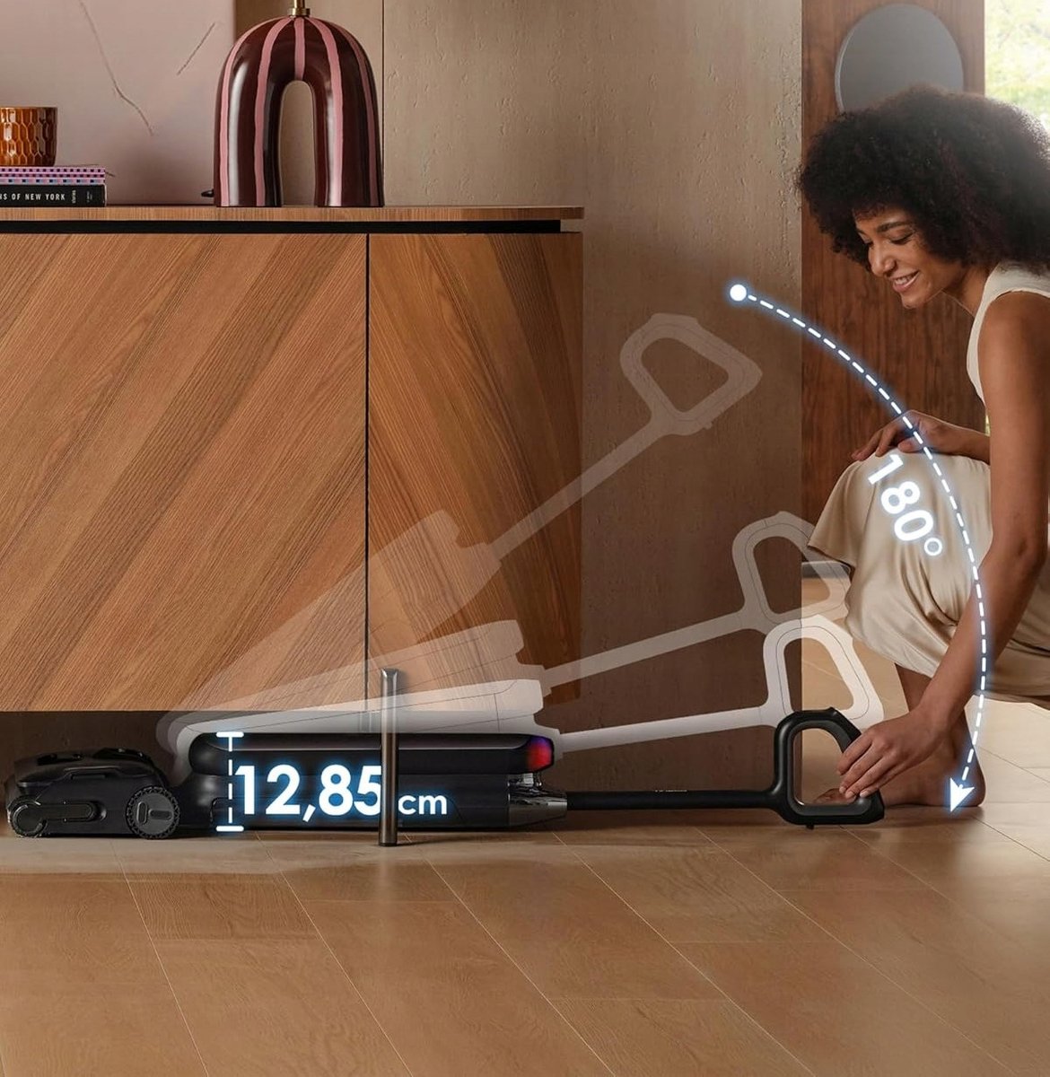 Możliwość rozłożenia na płasko w zakresie 180° i wyjątkowo smukła konstrukcja (tylko 12,85 cm): urządzenie do czyszczenia podłóg z łatwością dociera pod łóżka, sofy i do miejsc o ograniczonej przestrzeni, nie pozostawiając na nich kurzu ani włosów — idealne do dokładnego sprzątania.
