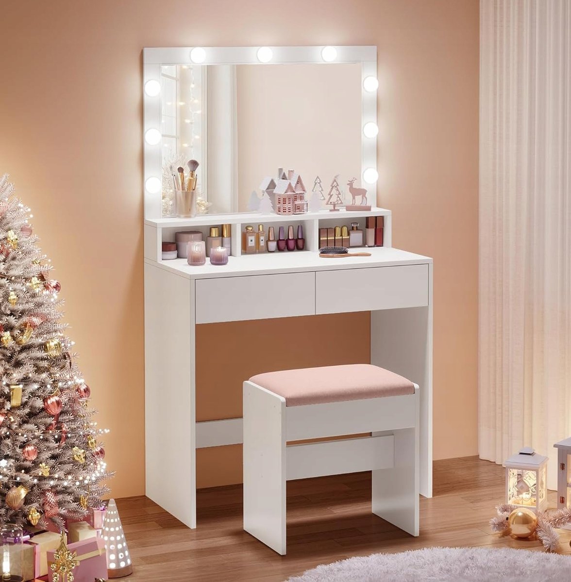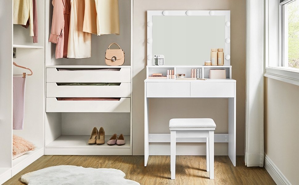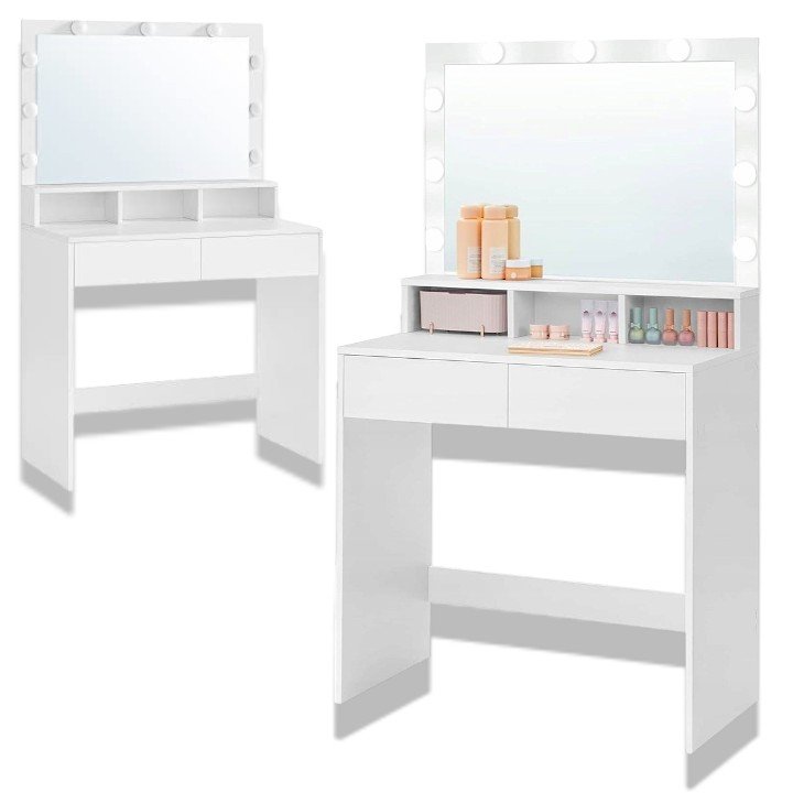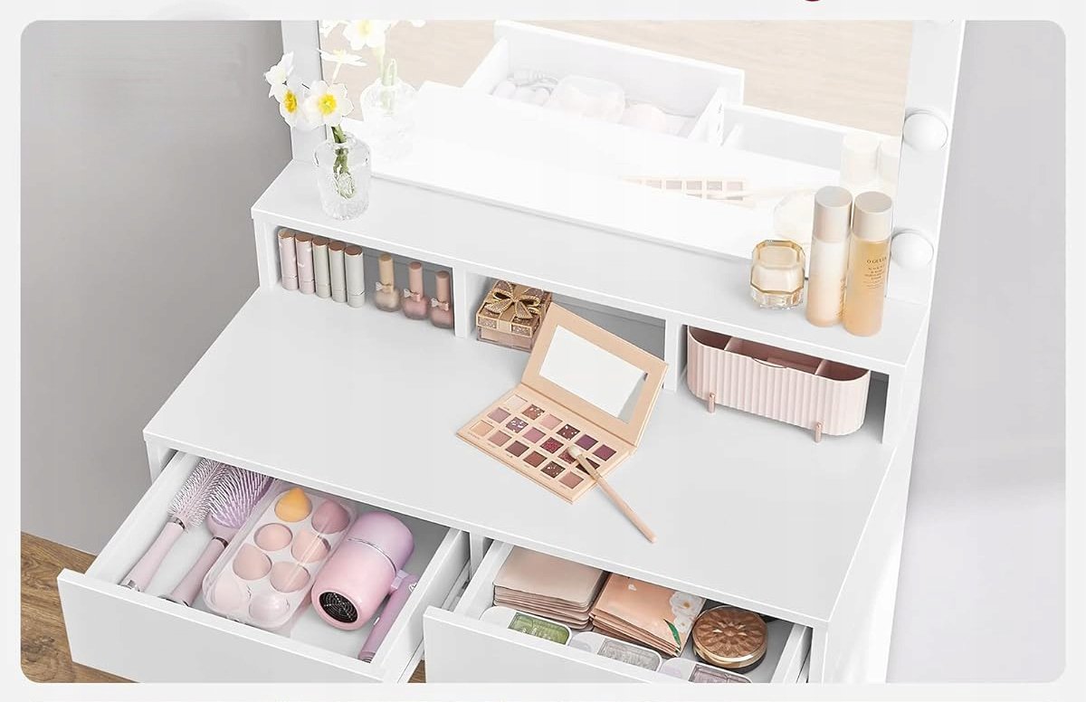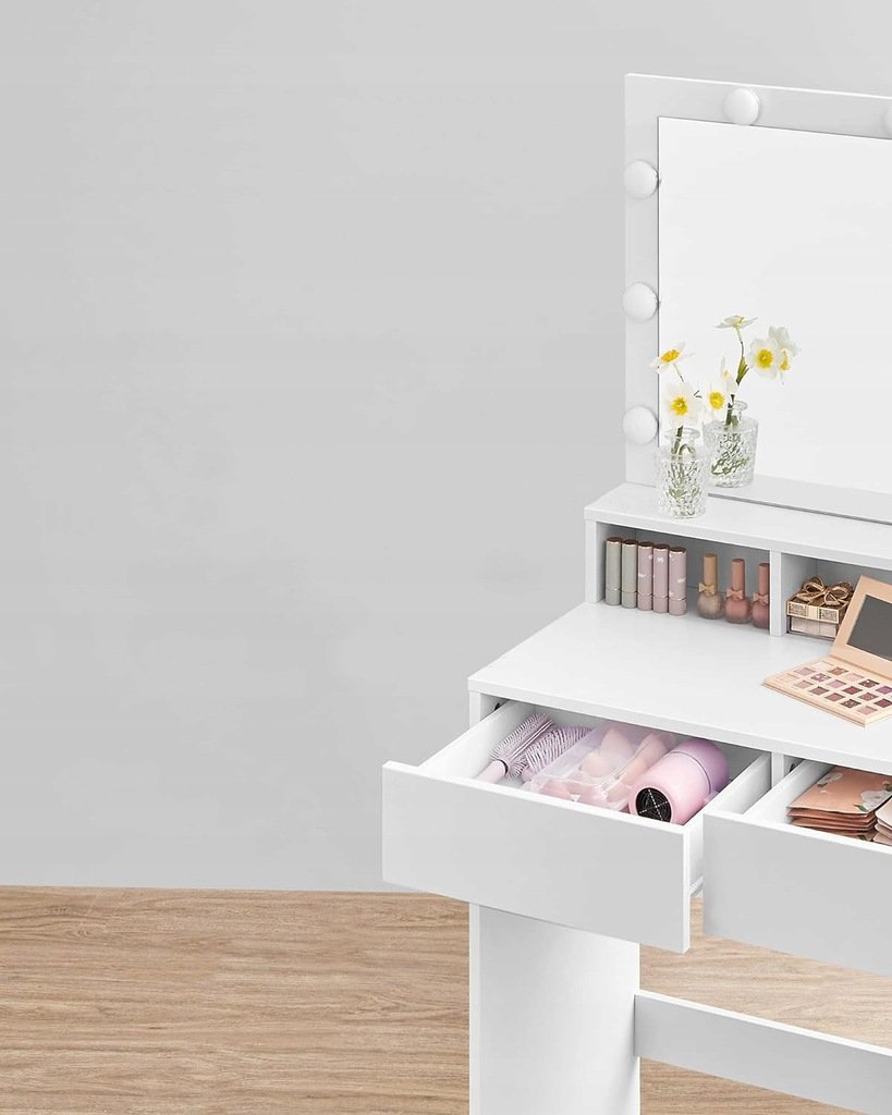 Właśnie zrecenzowałem Toaletka kosmetyczna z lustrem i oświetleniem Led, Toaletka do makijażu wizażu, Półki Szuflady 9 żarówek Led