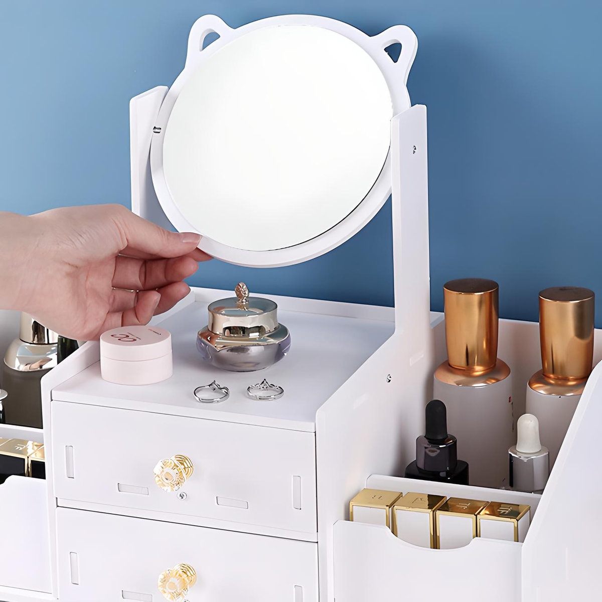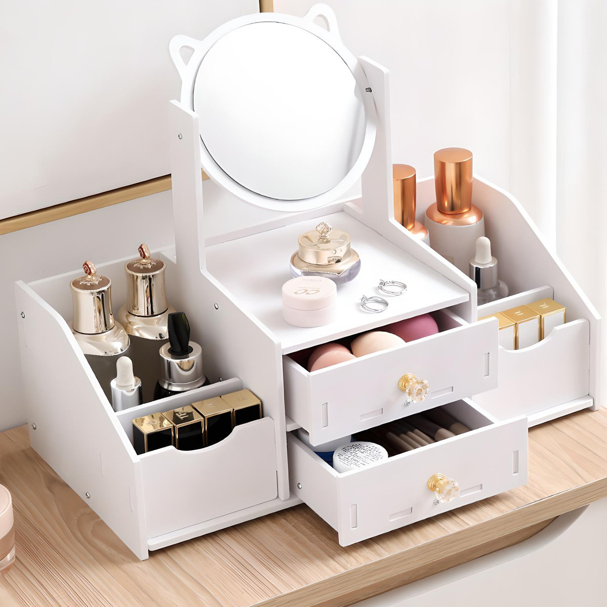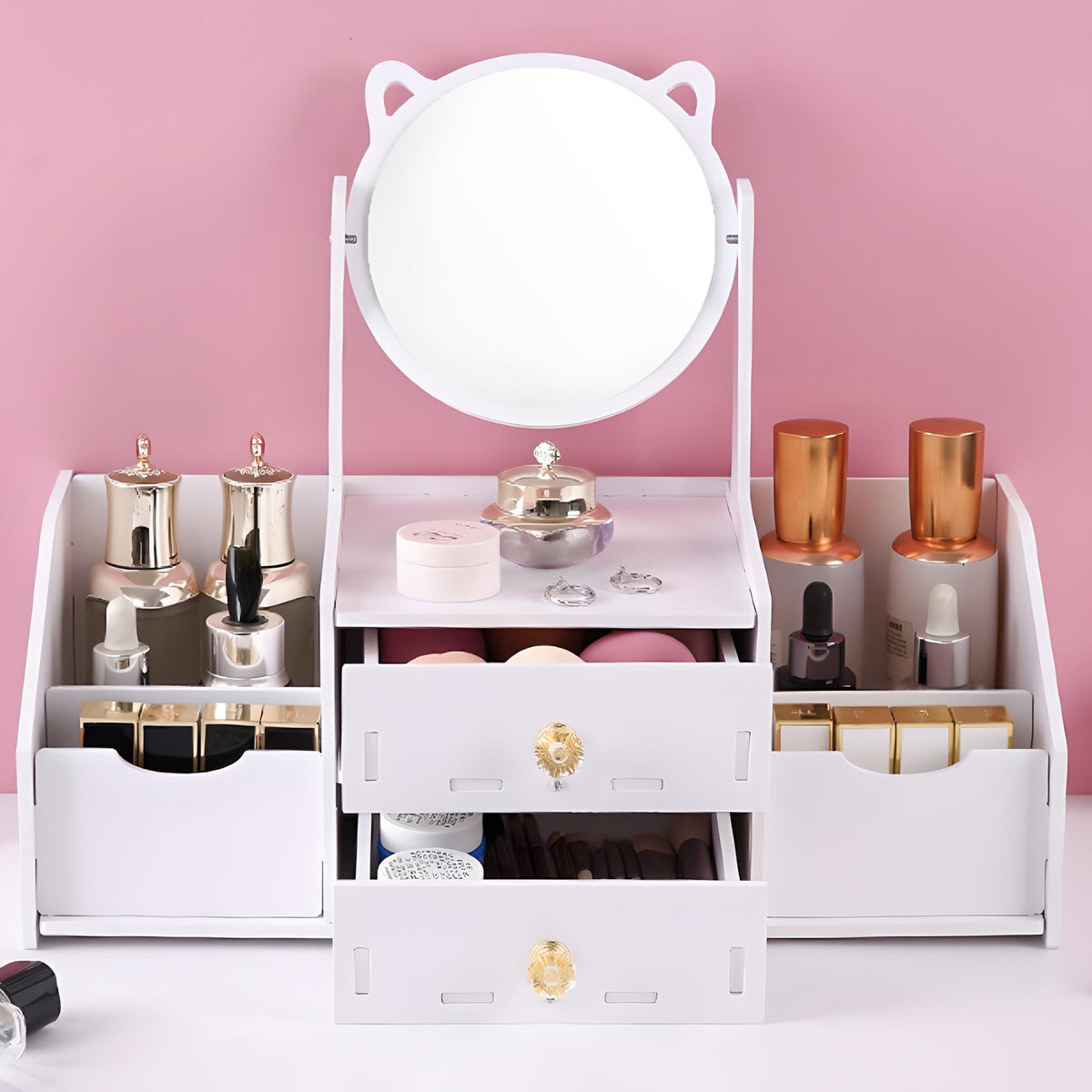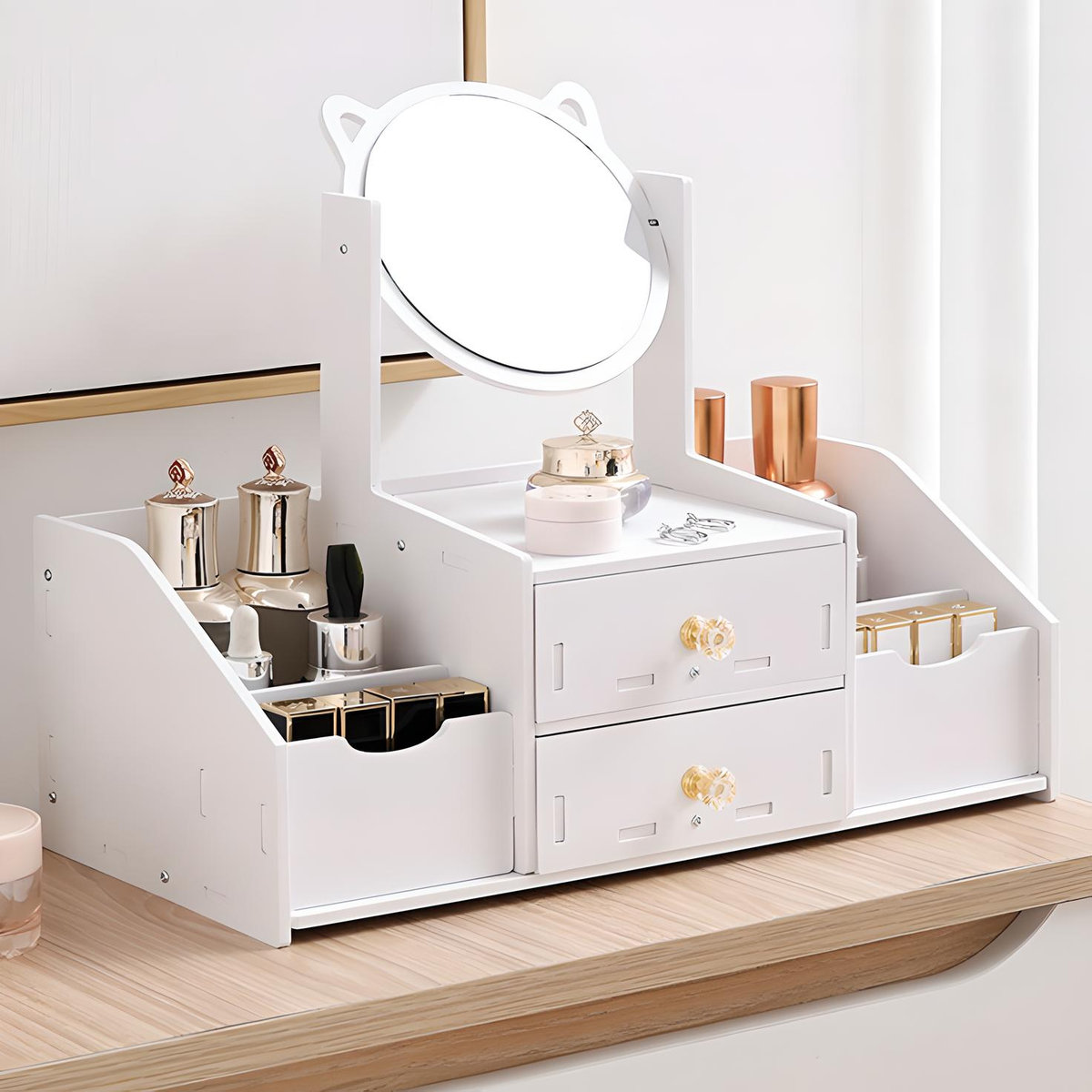 ✔️ Wyposażona jest w dwie szuflady z wygodnymi uchwytami oraz półki, które idealnie nadają się do przechowywania kosmetyków, pędzli czy biżuterii.