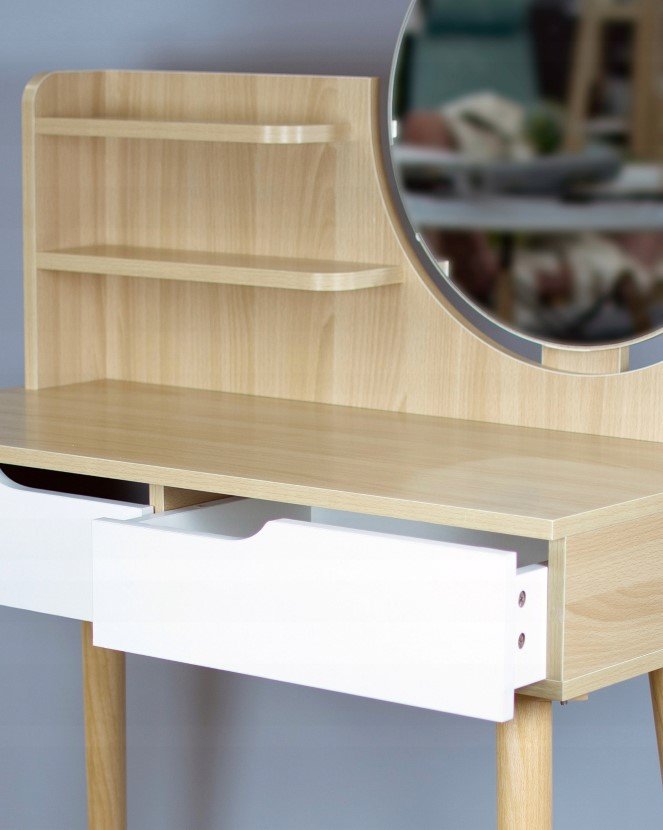 Mebel doskonale pasuje do sypialni jako praktyczne miejsce do wykonania makijażu, fryzury, codziennych pielęgnacyjnych czynności kosmetycznych, a także do napisania listu czy też przechowywania wielu rozmaitych drobiazgów.