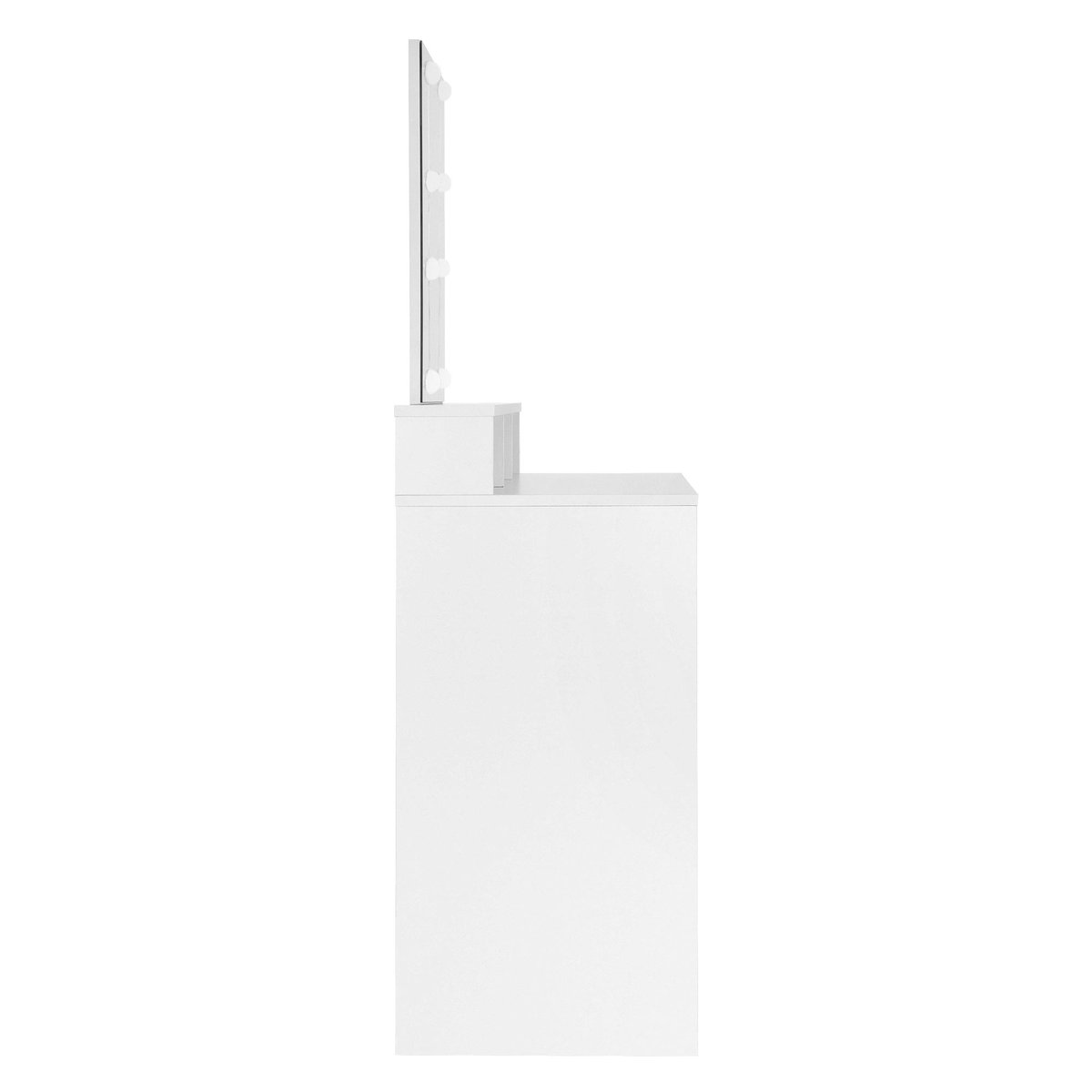 Oprócz lampek, toaletka posiada trzy otwarte schowki bezpośrednio na blacie, a także dwie dodatkowe szuflady. Możesz tam przechowywać wszystko, co chcesz trzymać poza zasięgiem wzroku. Trzy schowki tworzą cokół, na którym stoi lusterko do makijażu z lampkami. Ten optymalny układ pozwala dopracować nawet najmniejszy szczegół makijażu.